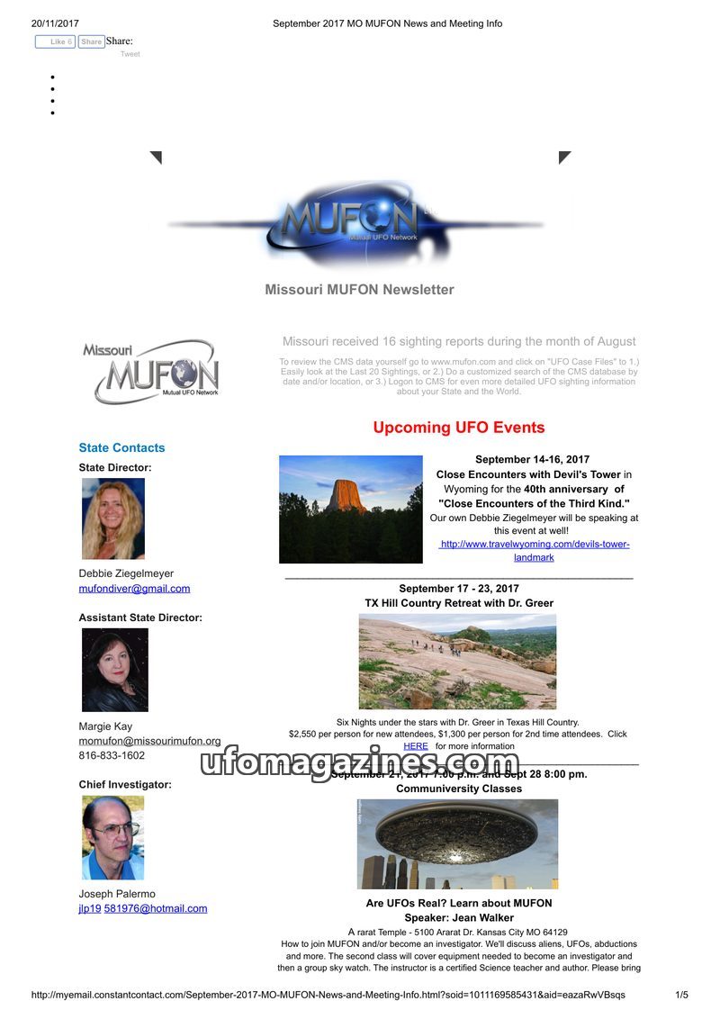The September 2017 Missouri MUFON Newsletter reports 16 UFO sightings in August. It details upcoming events including a 'Close Encounters with Devil's Tower' anniversary event in W