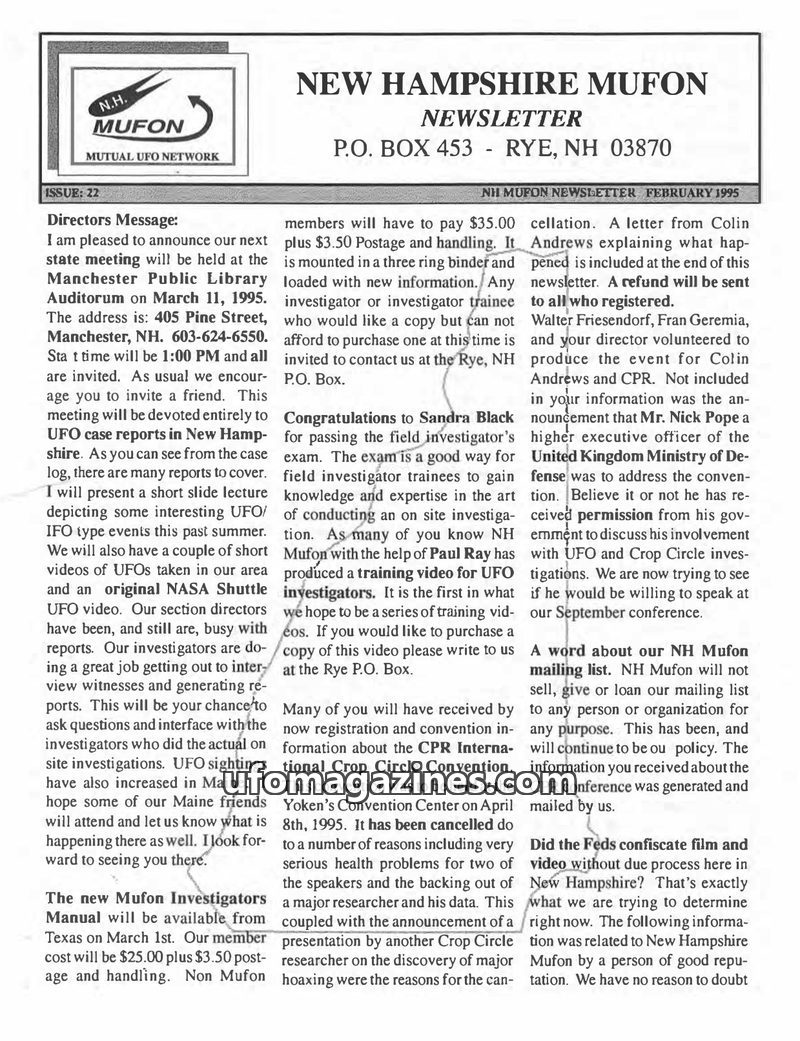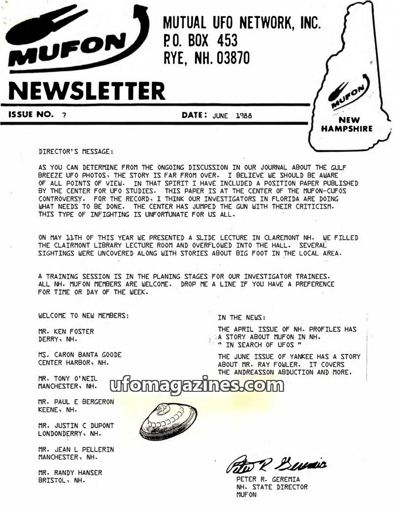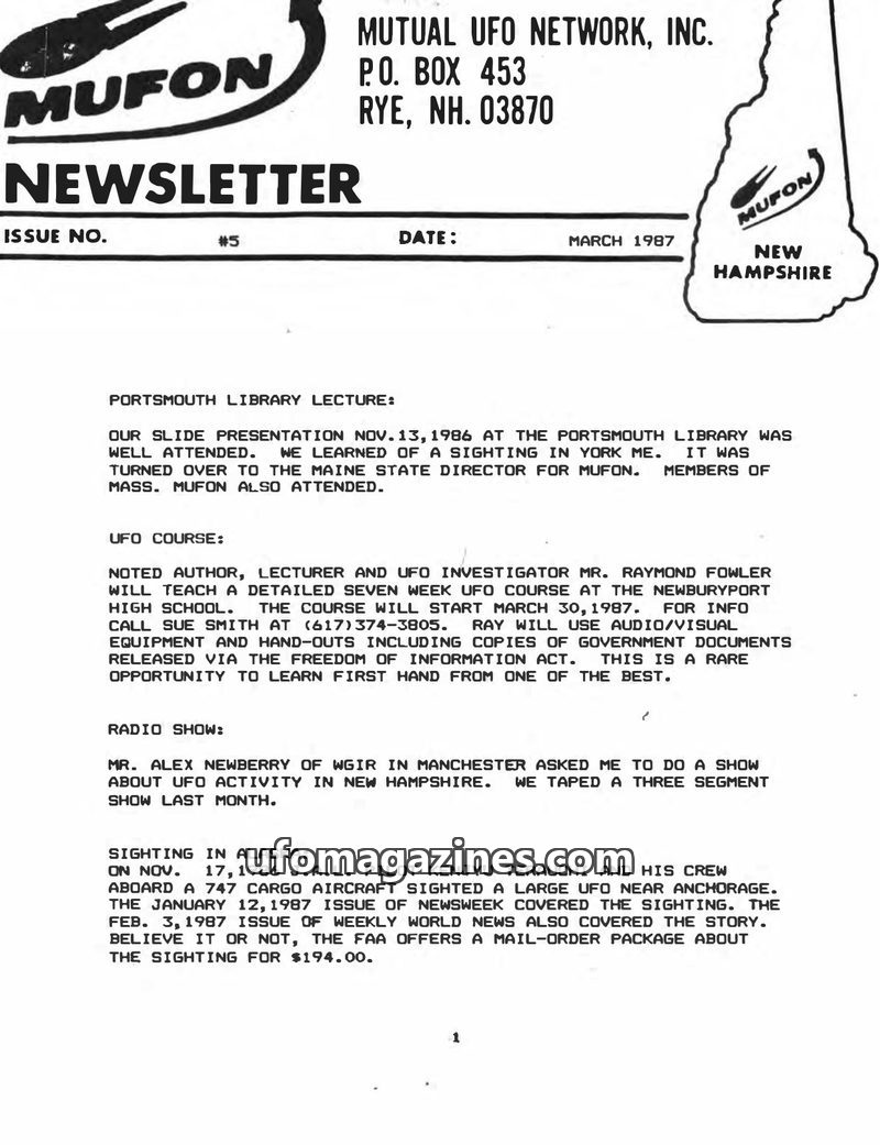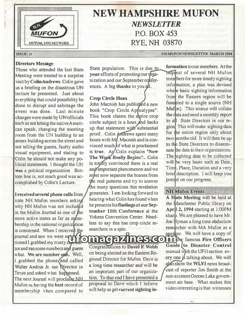 This issue of the NH MUFON Newsletter covers a range of topics including a report on a disastrous UN lecture by Colin Andrews, the announcement of a new book questioning the authen