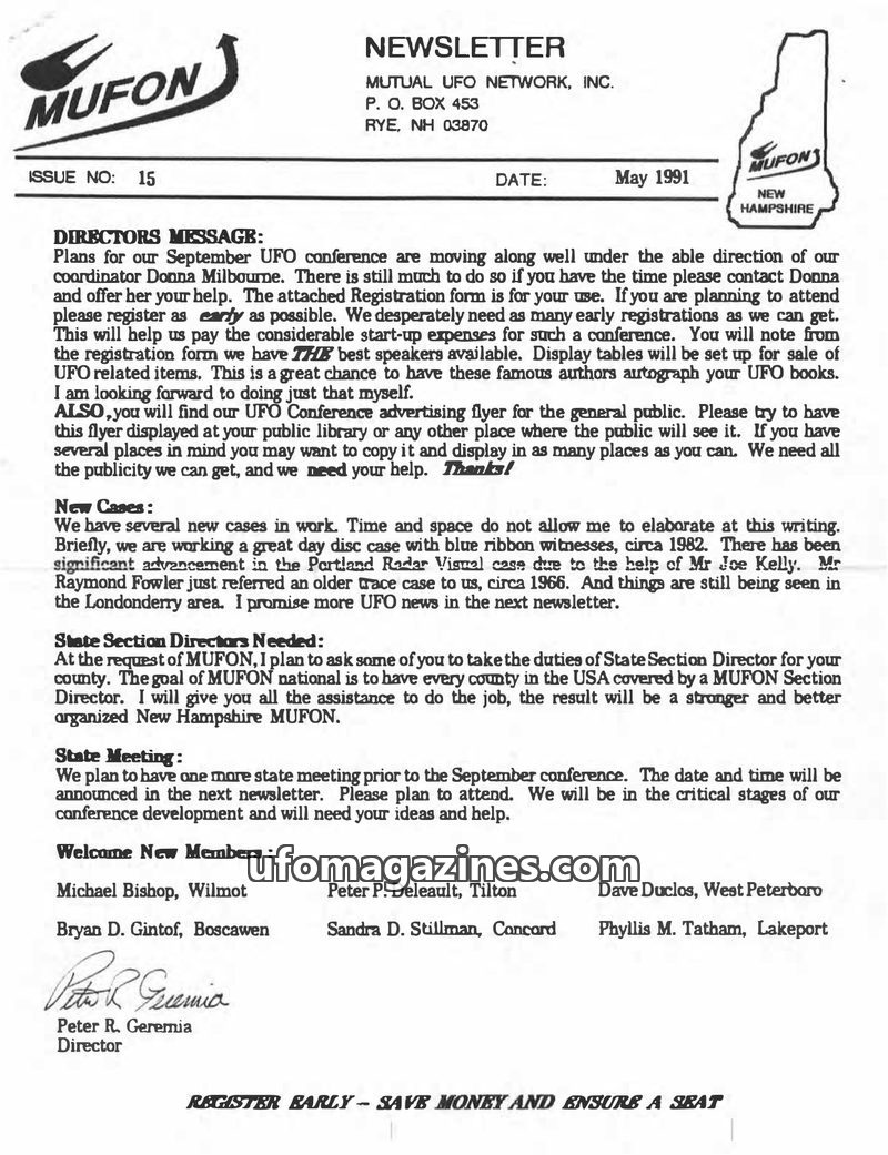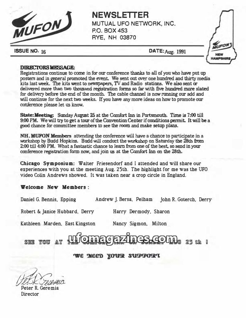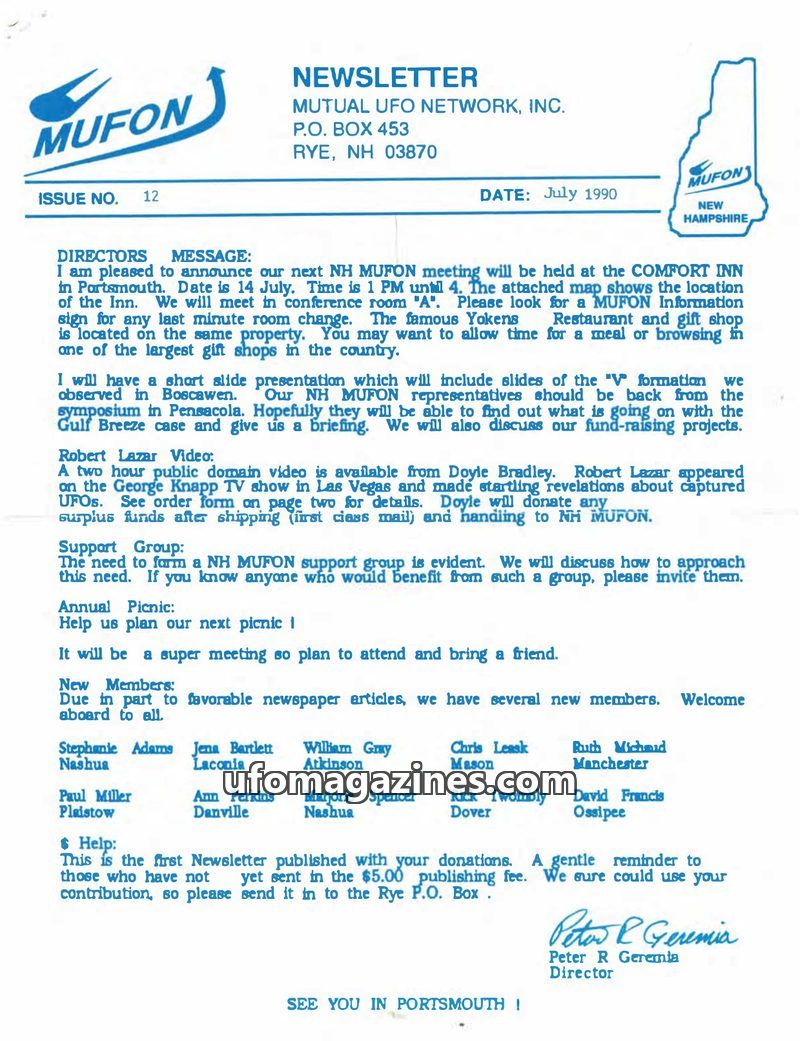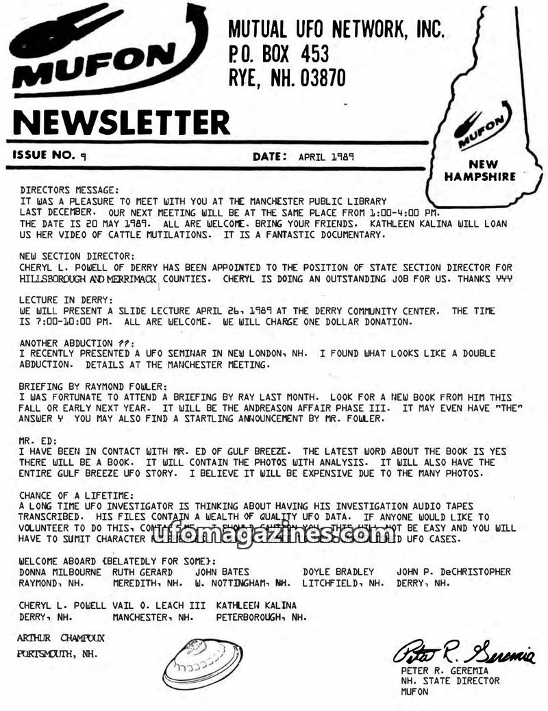 This issue of the NH MUFON Newsletter covers a range of topics including a report on a disastrous UN lecture by Colin Andrews, the announcement of a new book questioning the authen