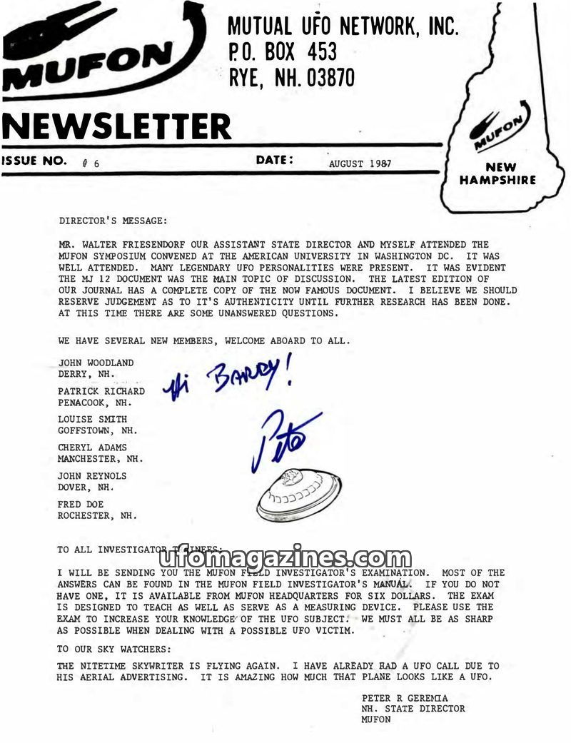 This issue of the MUFON Newsletter reports on the MUFON Symposium in Washington D.C., where the MJ 12 document was a major topic of discussion. It also welcomes new members, announ