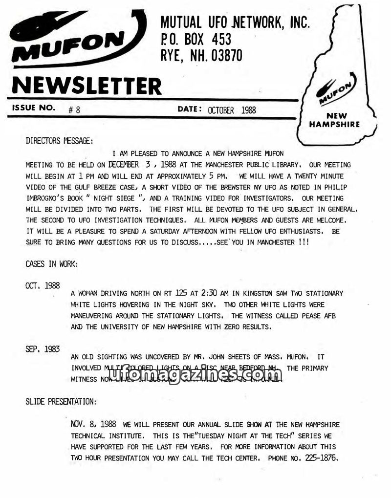This MUFON Newsletter, Issue #8 from October 1988, announces an upcoming meeting in Manchester, NH, on December 3, 1988, featuring videos on the Gulf Breeze Case and the Brewster,