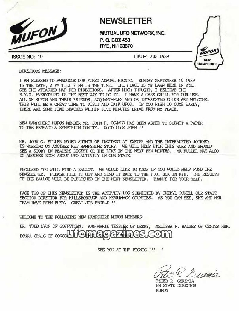 This August 1989 MUFON Newsletter (Issue 10) announces the first annual New Hampshire MUFON picnic to be held on September 10, 1989. It highlights the upcoming submission of a pape
