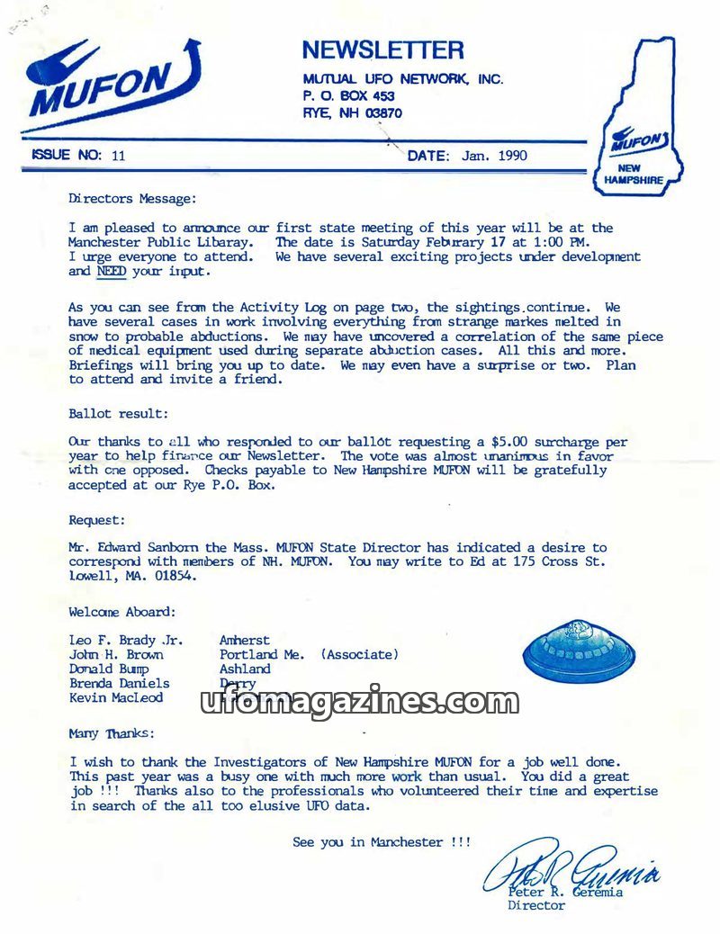 The January 1990 MUFON Newsletter announces the first New Hampshire state meeting in Manchester on February 17th, encouraging attendance and input. It reports on ongoing UFO sighti