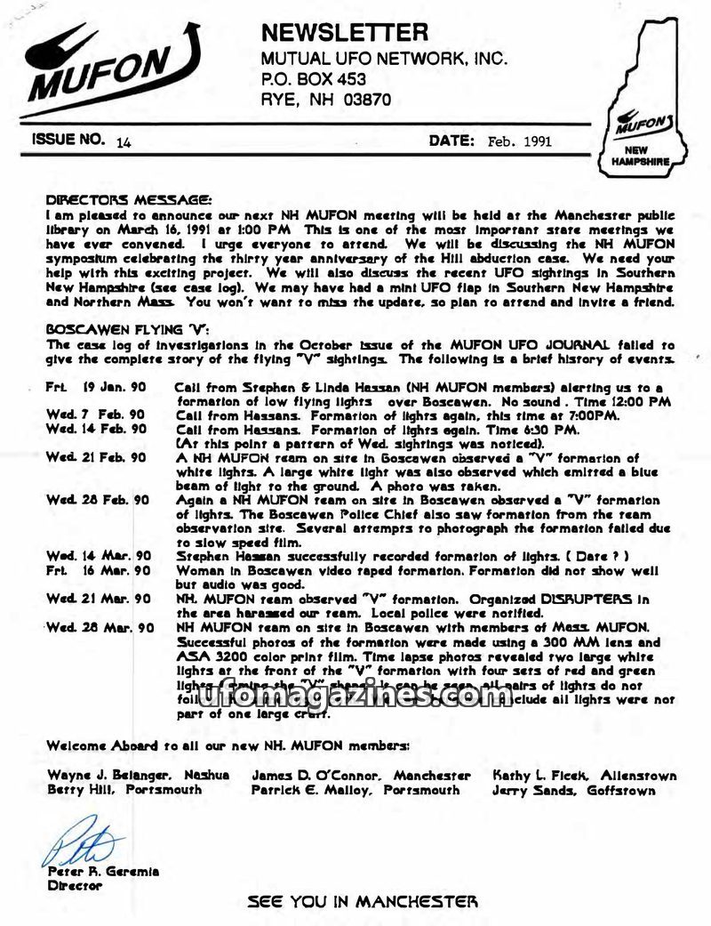 This issue of the MUFON Newsletter (Issue 14, Feb 1991) announces an upcoming NH MUFON meeting in Manchester on March 16, 1991, to discuss the Hill abduction case anniversary and r