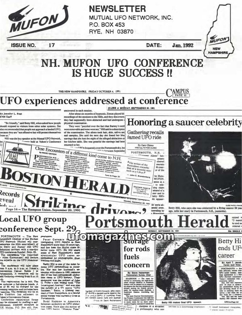 This issue of the MUFON Newsletter highlights the success of the New Hampshire MUFON UFO Conference, featuring Betty Hill as the key speaker. The conference commemorated the 30th a