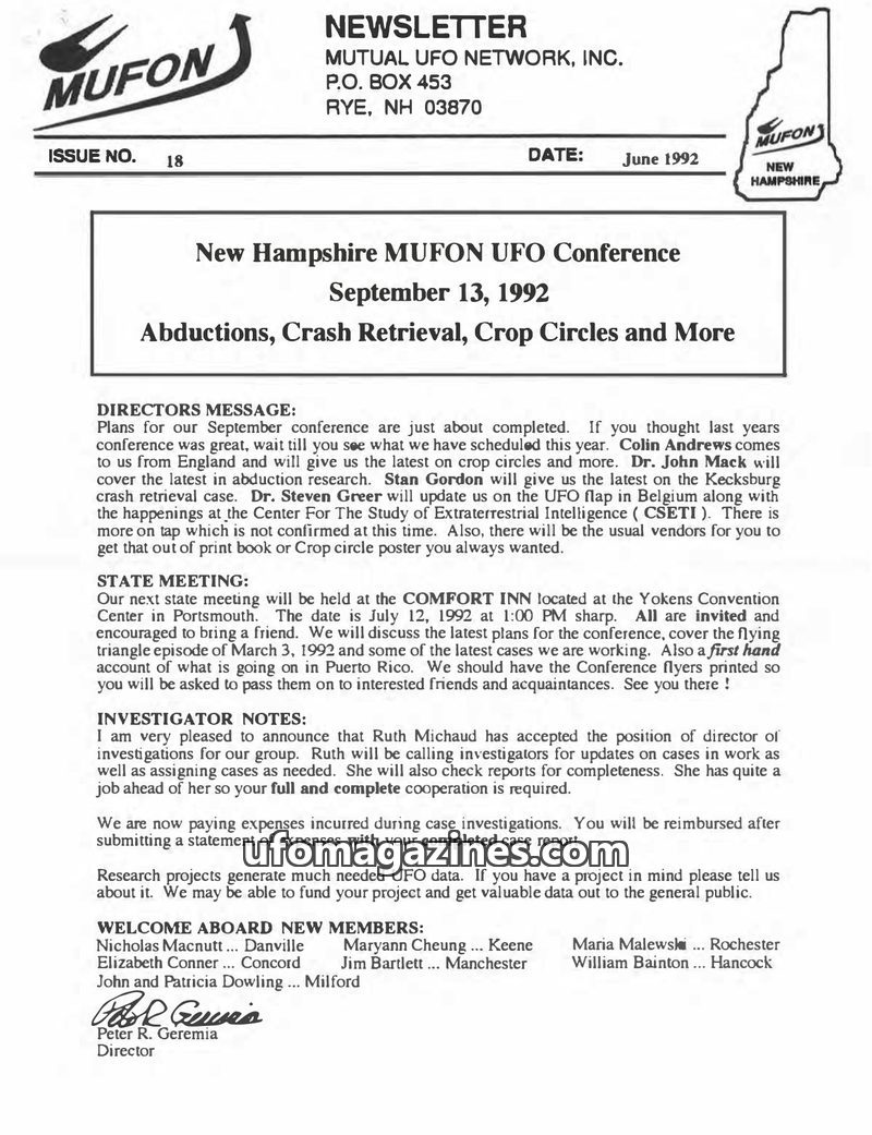This June 1992 MUFON Newsletter announces the upcoming New Hampshire MUFON UFO Conference on September 13, 1992, featuring speakers on crop circles, abduction research, the Kecksbu