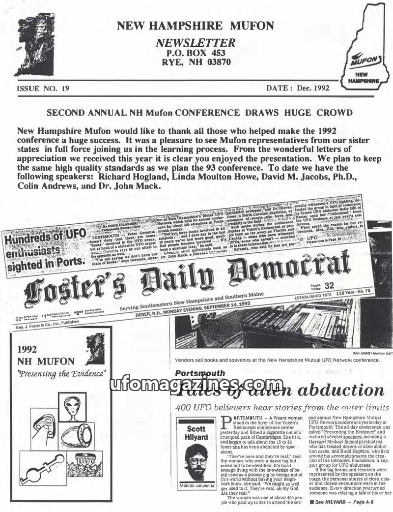 The New Hampshire MUFON Newsletter issue 19 from December 1992 covers the success of the Second Annual NH MUFON Conference, which drew a large crowd and featured speakers such as R