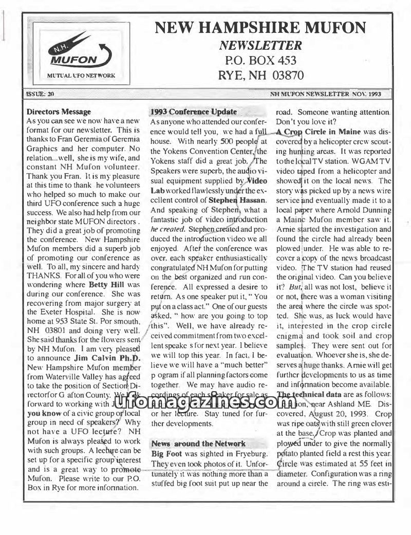 This issue of the NH MUFON Newsletter covers the success of the 1993 UFO conference, highlighting the venue, speakers, and positive feedback. It also reports on various UFO sightin