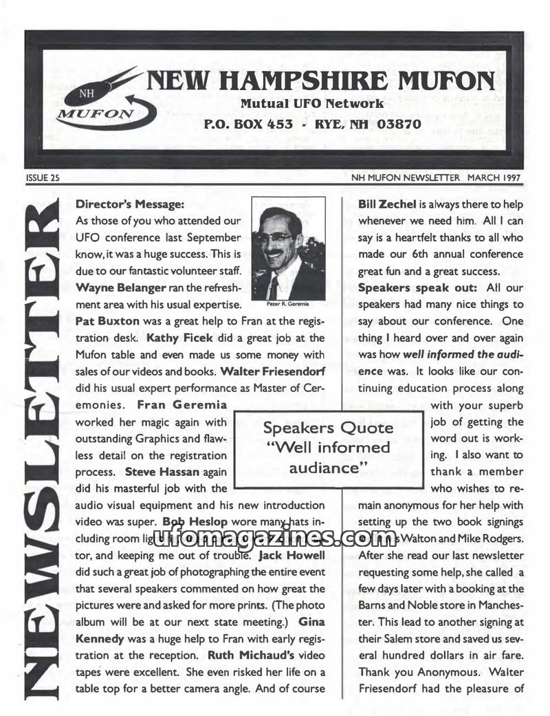 This issue of the NH MUFON Newsletter from March 1997 highlights the success of their recent UFO conference, thanking numerous volunteers. It details new board appointments and upc