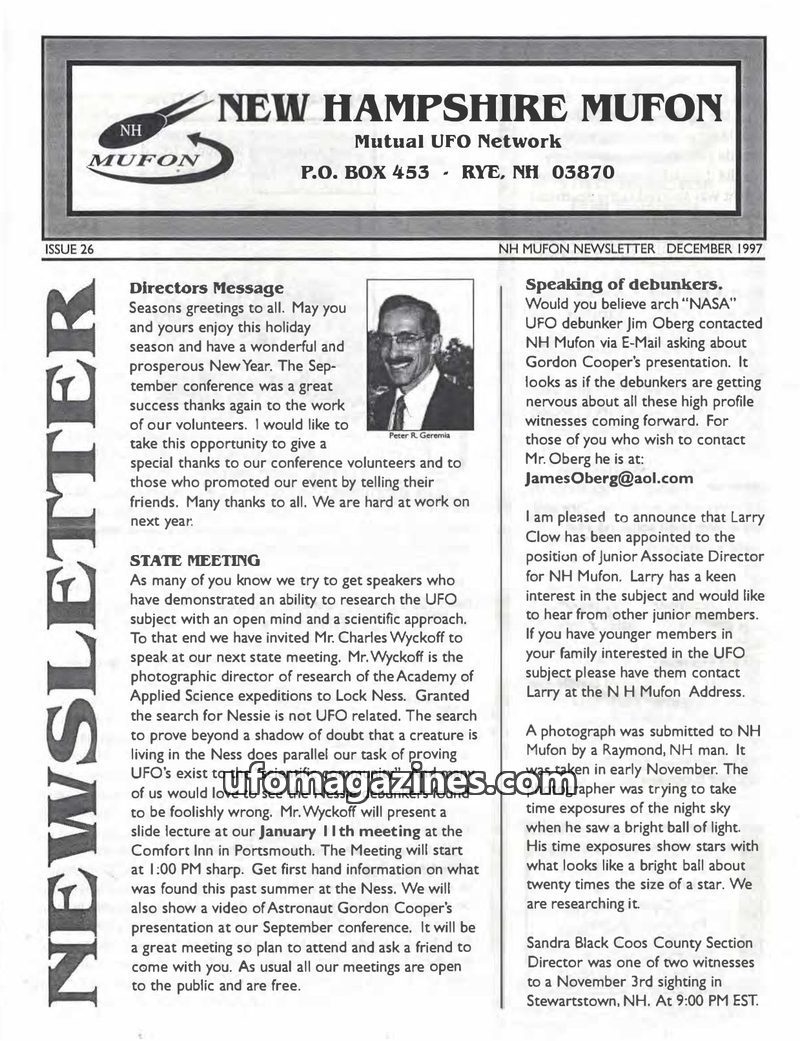 This issue of the New Hampshire MUFON Newsletter from December 1997 covers upcoming meetings, recent UFO sightings in New Hampshire, and features an article on Astronaut Gordon Coo