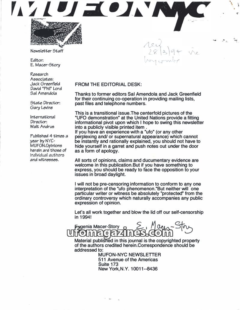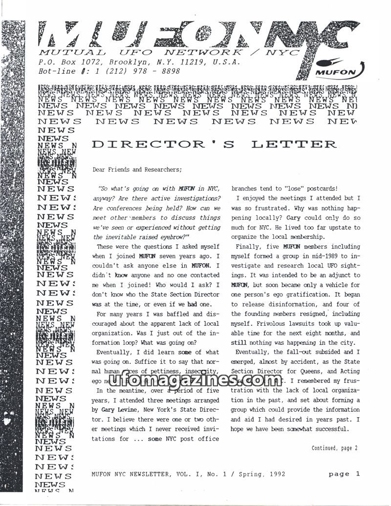 MUFON NYC Newsletter - Vol 1 No 1 - 1992