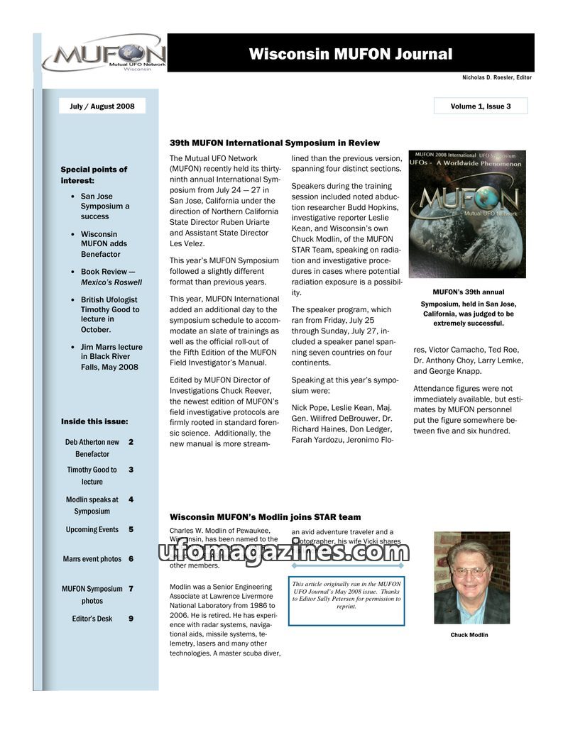 The July/August 2008 Wisconsin MUFON Journal covers the 39th MUFON International Symposium in San Jose, California, highlighting speakers like Budd Hopkins, Leslie Kean, and Chuck