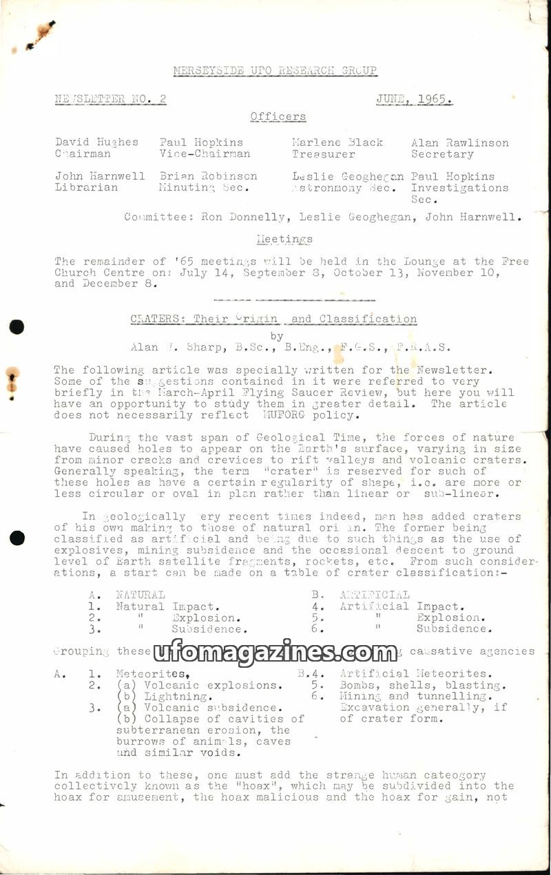 This issue of the Merseyside UFO Research Group Newsletter from June 1965 focuses on the geological origins of craters, arguing that many reported UFO craters have natural or artif