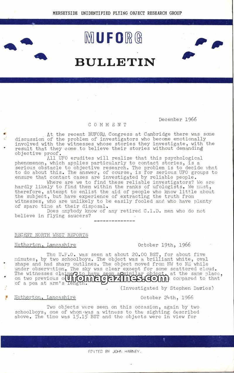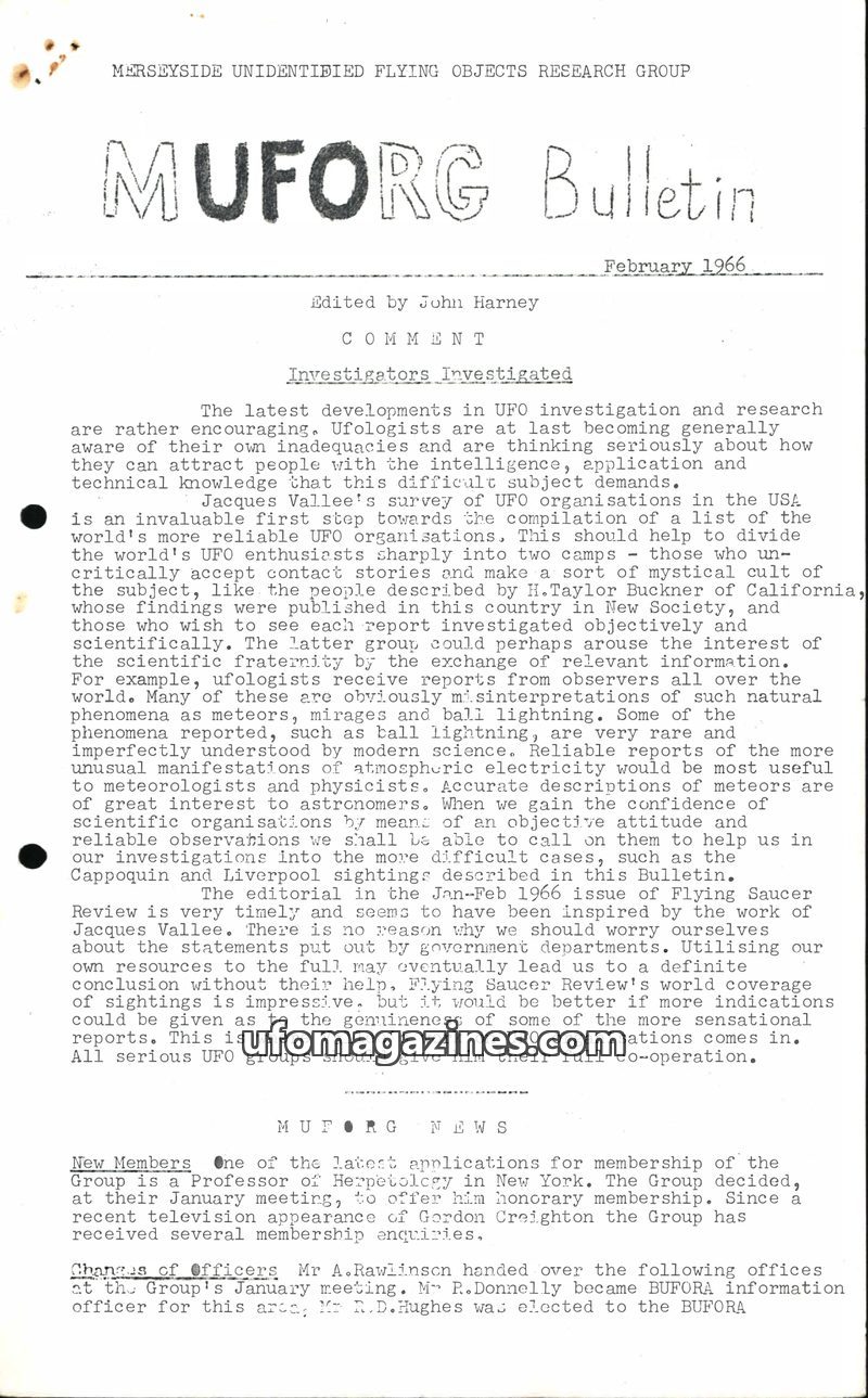 This issue of the MUFORG Bulletin from April 1966 covers recent UFO sightings in the North West of England, including detailed reports from Bootle, Wigan, and Wilmslow. It also fea