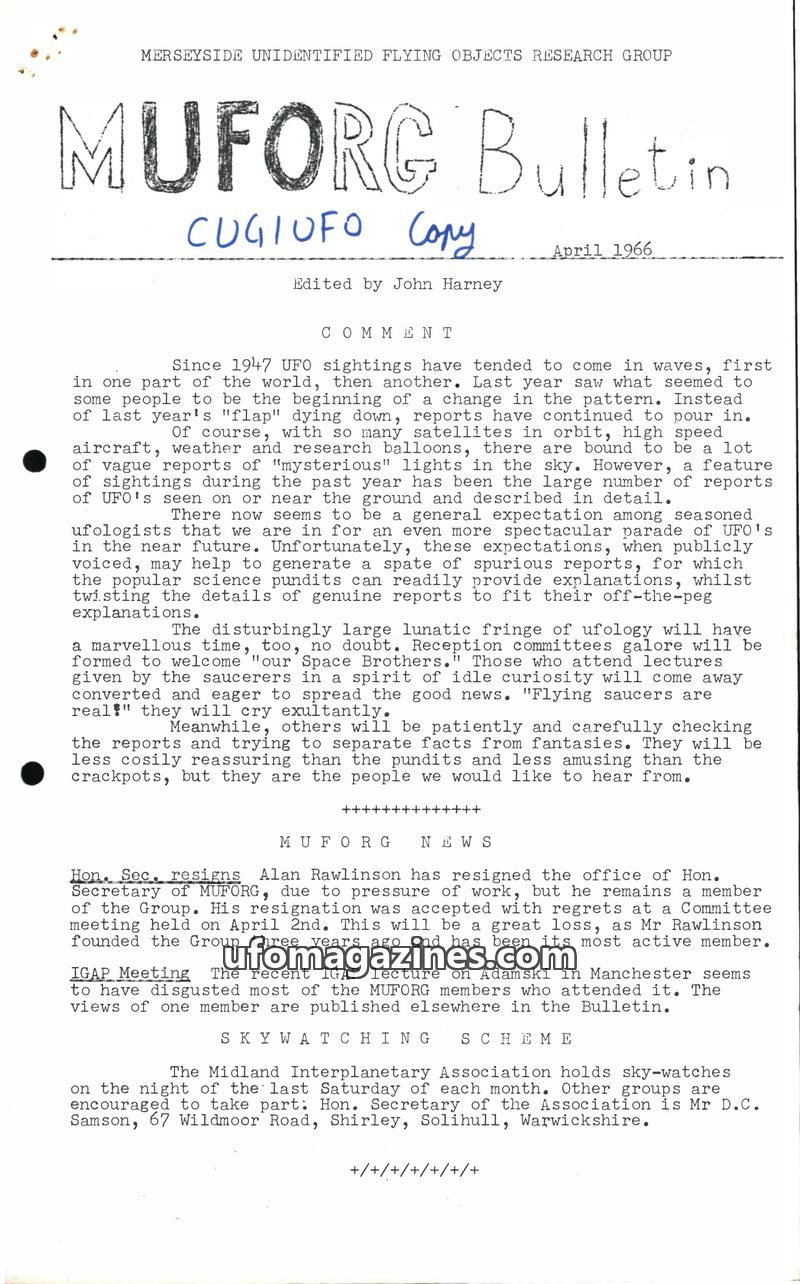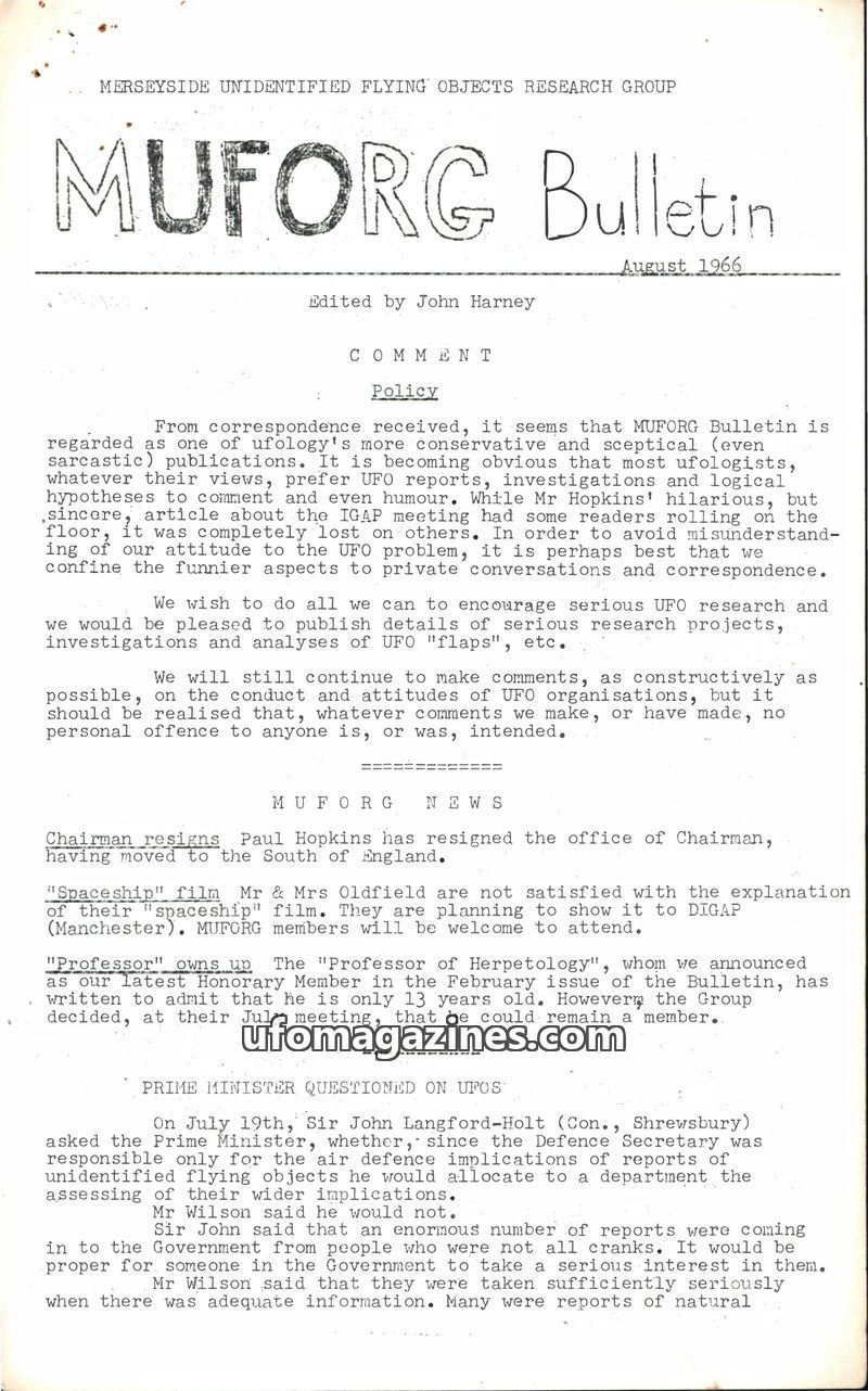 This issue of the MUFORG Bulletin, dated August 1966, addresses its perceived conservative stance and encourages serious UFO research. It reports on the resignation of its chairman