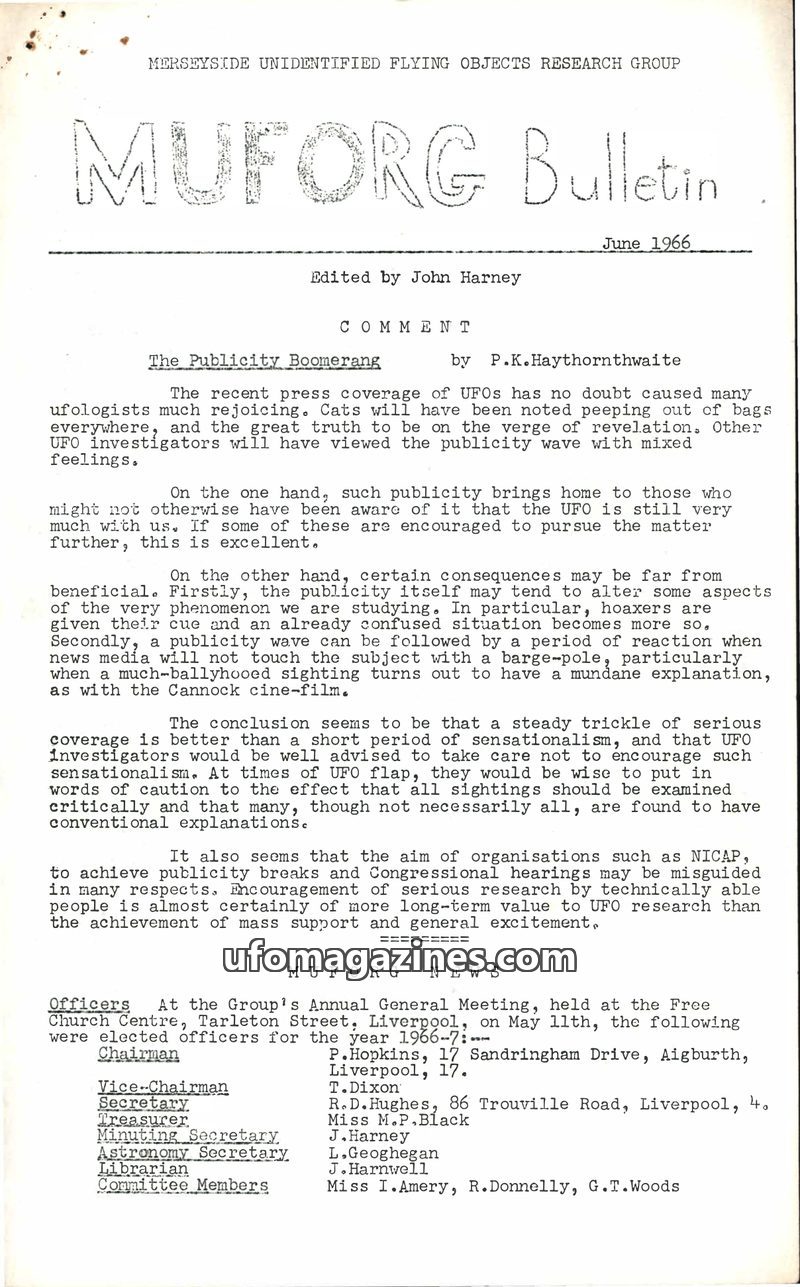 This issue of the MUFORG Bulletin discusses the impact of UFO publicity, cautioning against sensationalism and advocating for serious research. It reports on the election of office