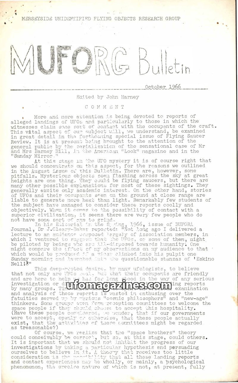 The October 1966 MUFORG Bulletin focuses on UFO landings and contactee reports, urging critical examination and caution against premature belief in 'space brothers'. It highlights