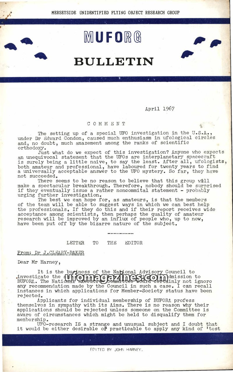 This issue of the MUFORG Bulletin from April 1967 discusses the US UFO investigation led by Dr. Edward Condon, expressing skepticism about a spectacular breakthrough but hoping for