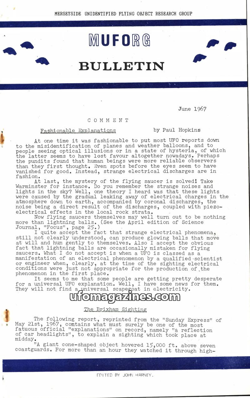 This issue of the MUFORG Bulletin from June 1967 features a 'Comment' section by Paul Hopkins discussing fashionable explanations for UFOs, particularly electrical phenomena and ca