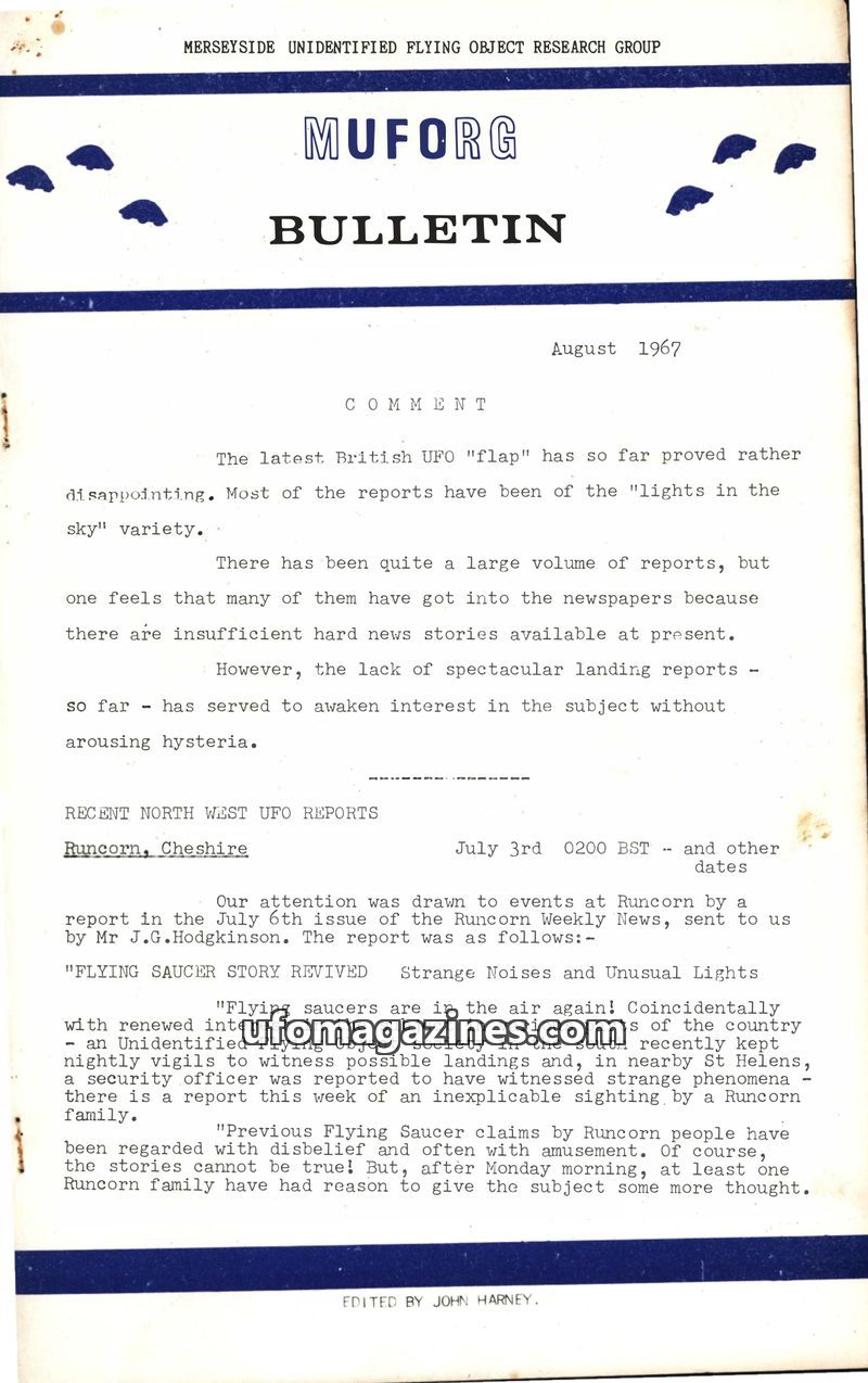 The August 1967 MUFORG Bulletin reports on a recent 'flap' of UFO sightings in the UK, primarily in the North West. While many reports are of 'lights in the sky', the issue details