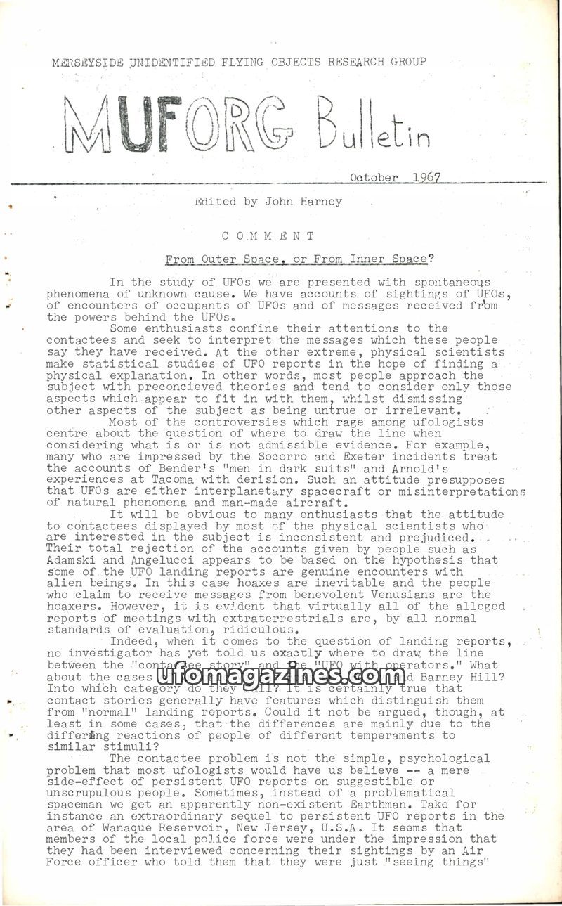 This issue of the MUFORG Bulletin delves into the debate surrounding the origin of UFOs, questioning whether they are from 'Outer Space or Inner Space?'. It contrasts the approache