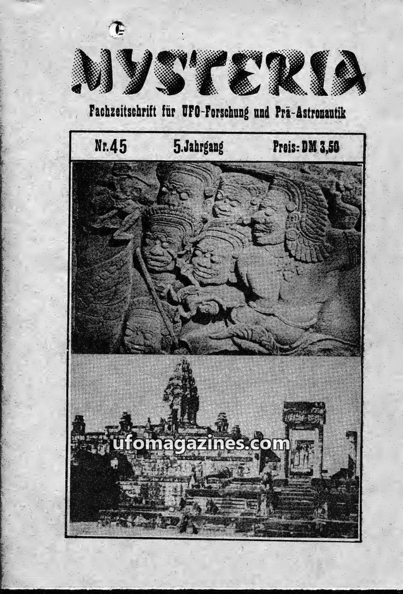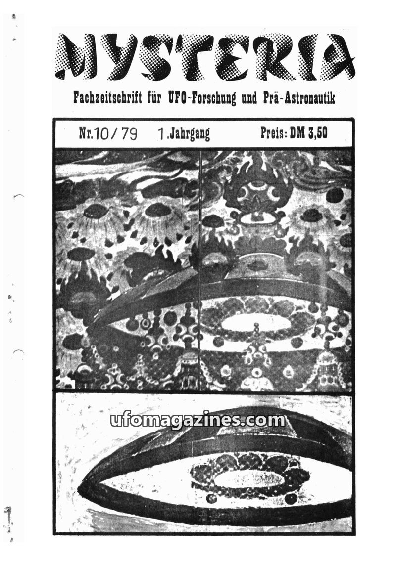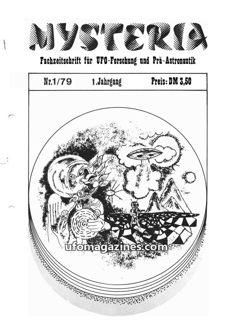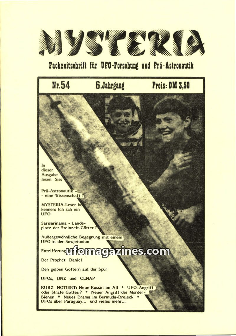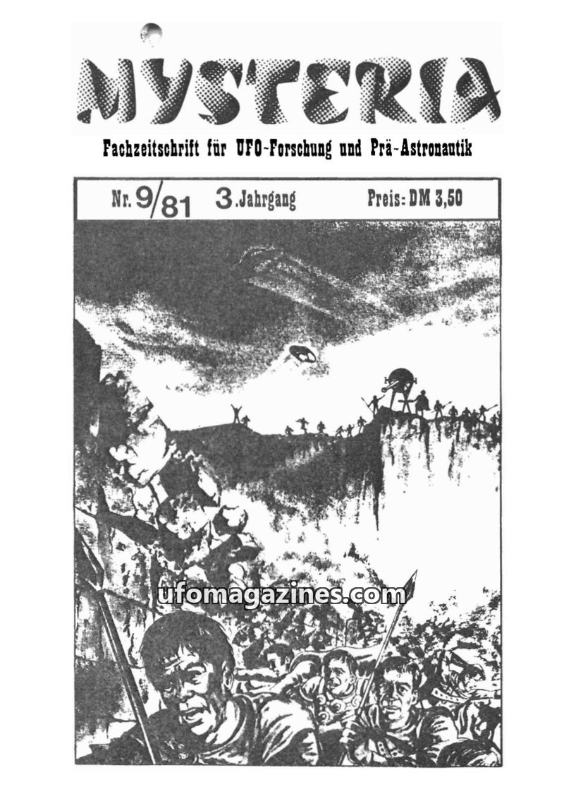This issue of MYSTERIA focuses on UFO research and pre-astronautics. It includes a TV analysis of Erich von Däniken's work, a detailed account of an Austrian Air Force attempt to i