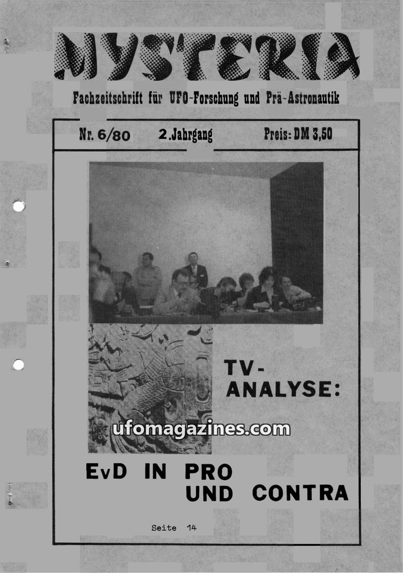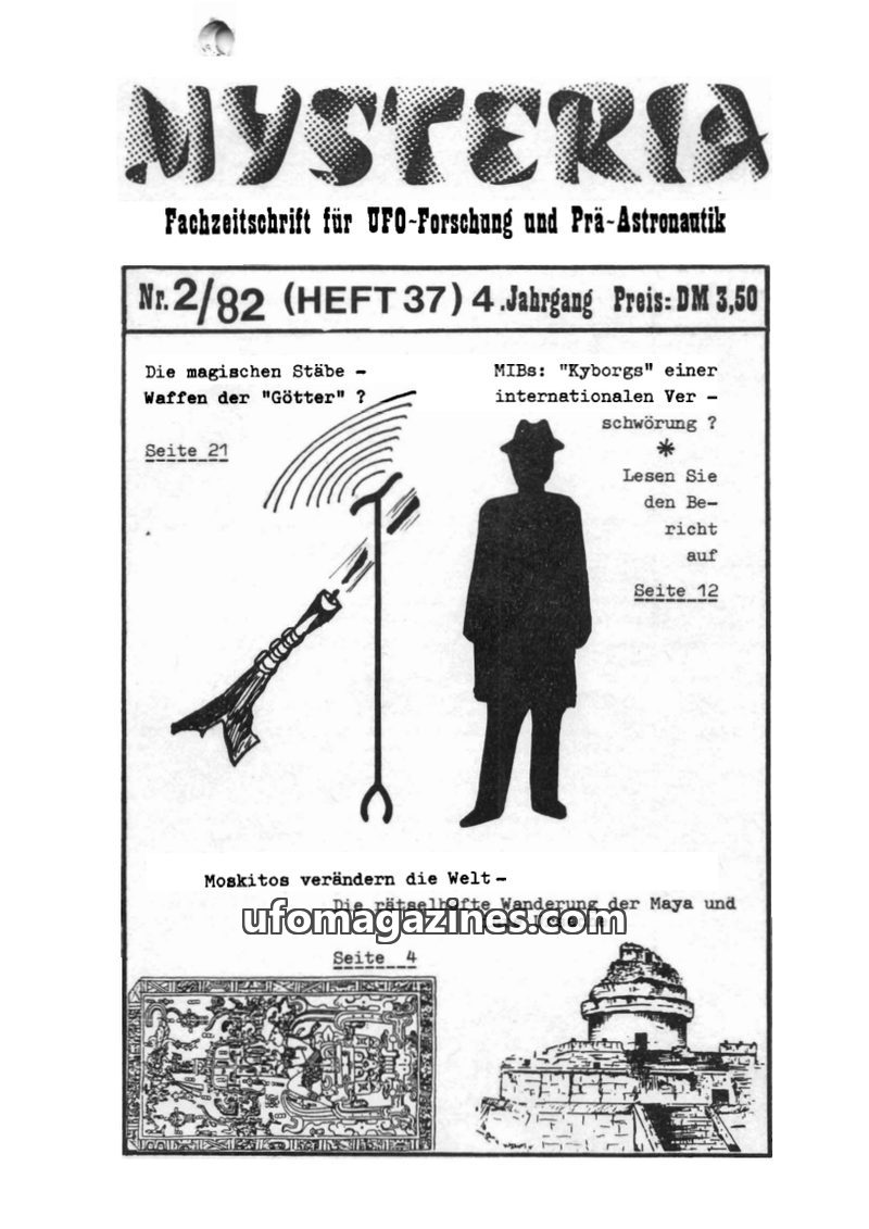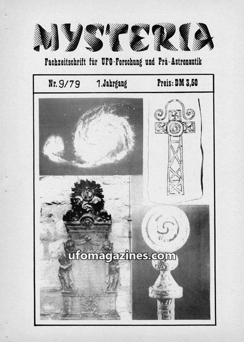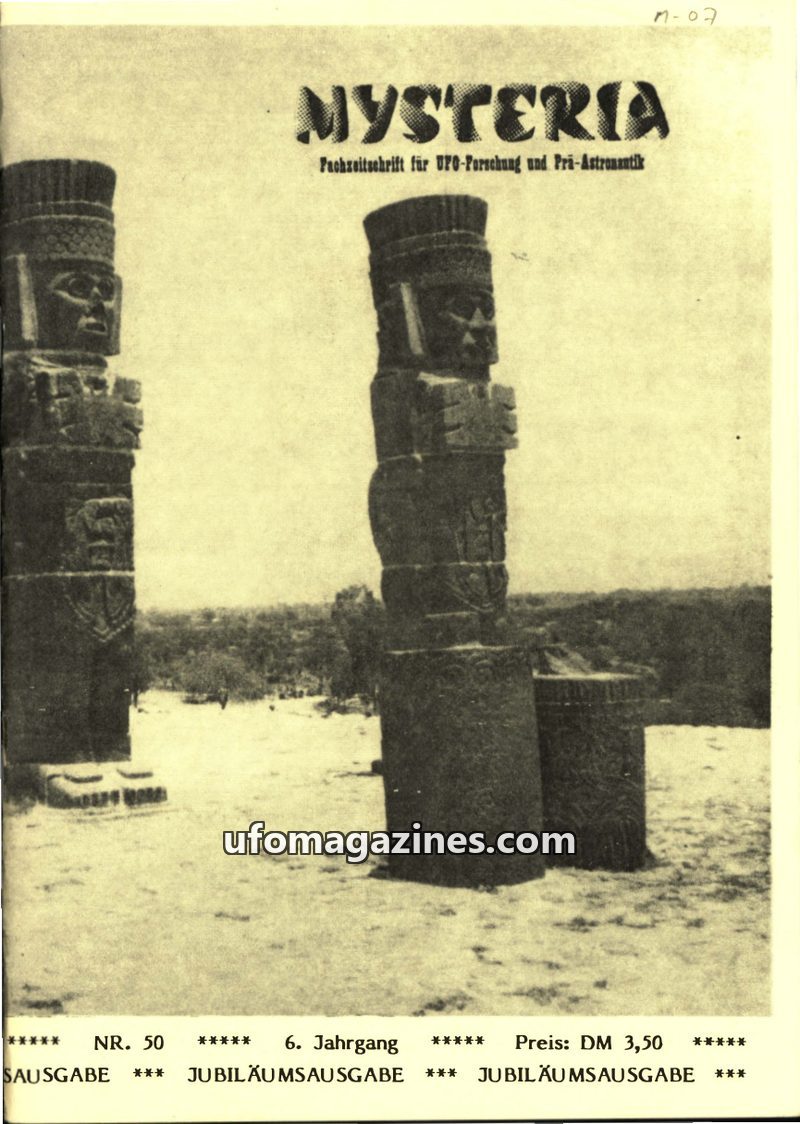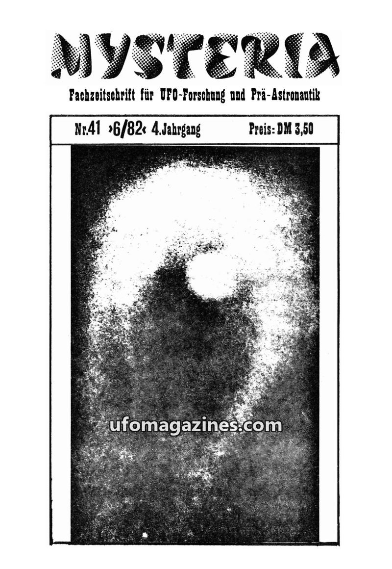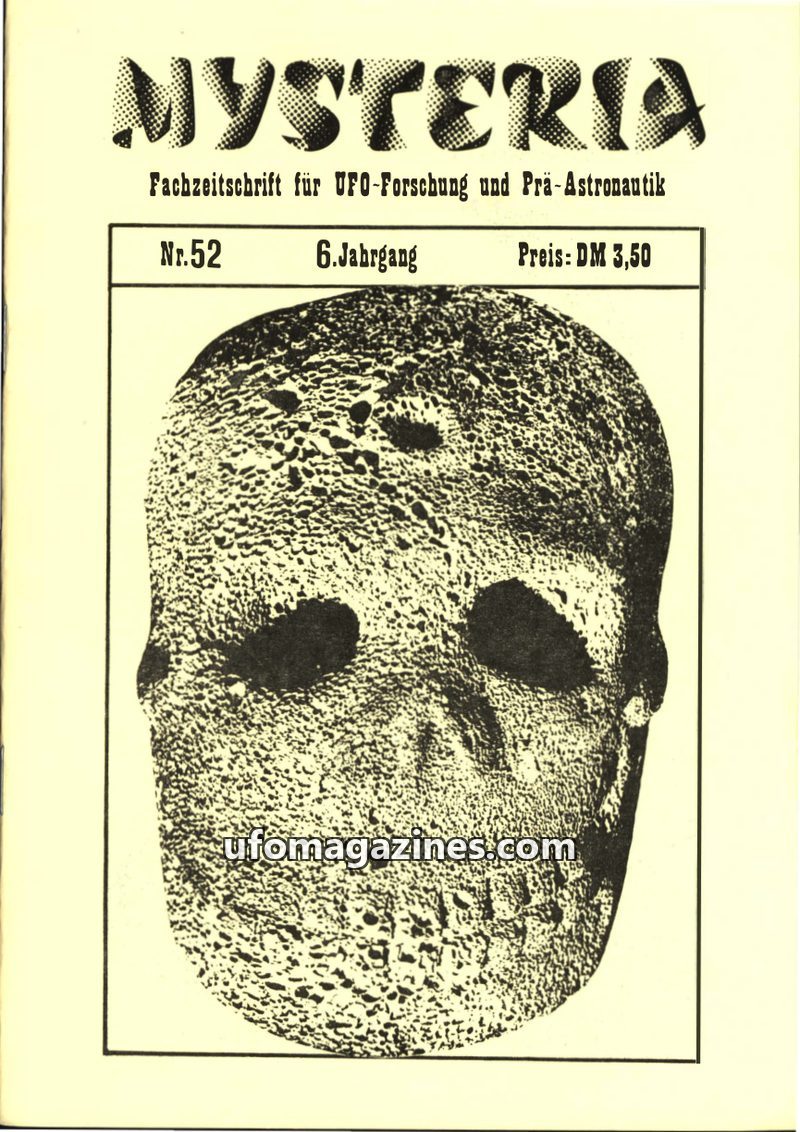 This issue of MYSTERIA focuses on UFO research and pre-astronautics. It includes a TV analysis of Erich von Däniken's work, a detailed account of an Austrian Air Force attempt to i