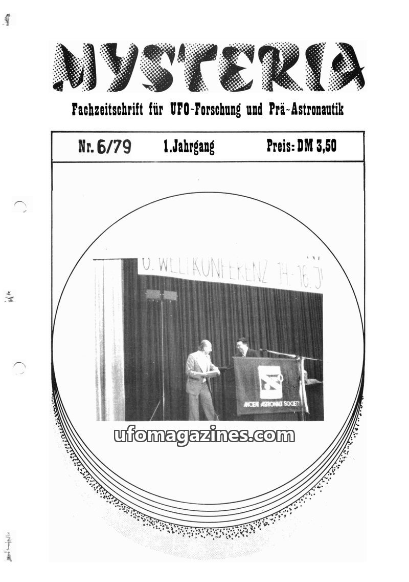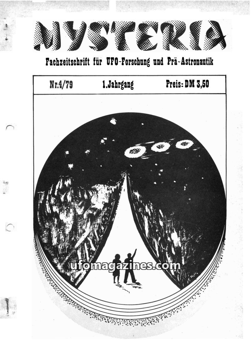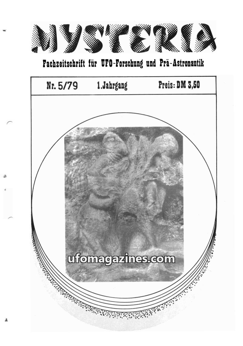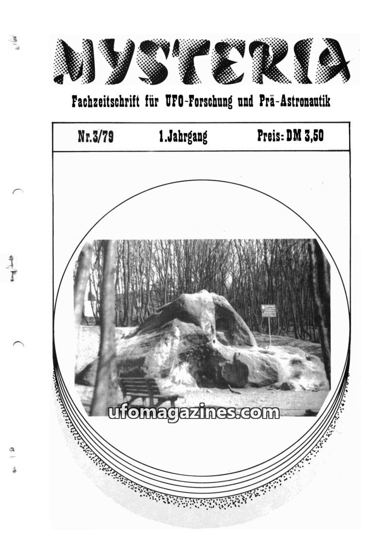 This issue of MYSTERIA magazine, dated 6/79, focuses on UFO research and pre-astronautics. It includes an article on the Externsteine in Germany as a potential prehistoric UFO base