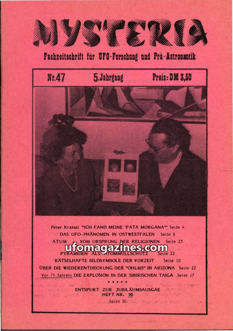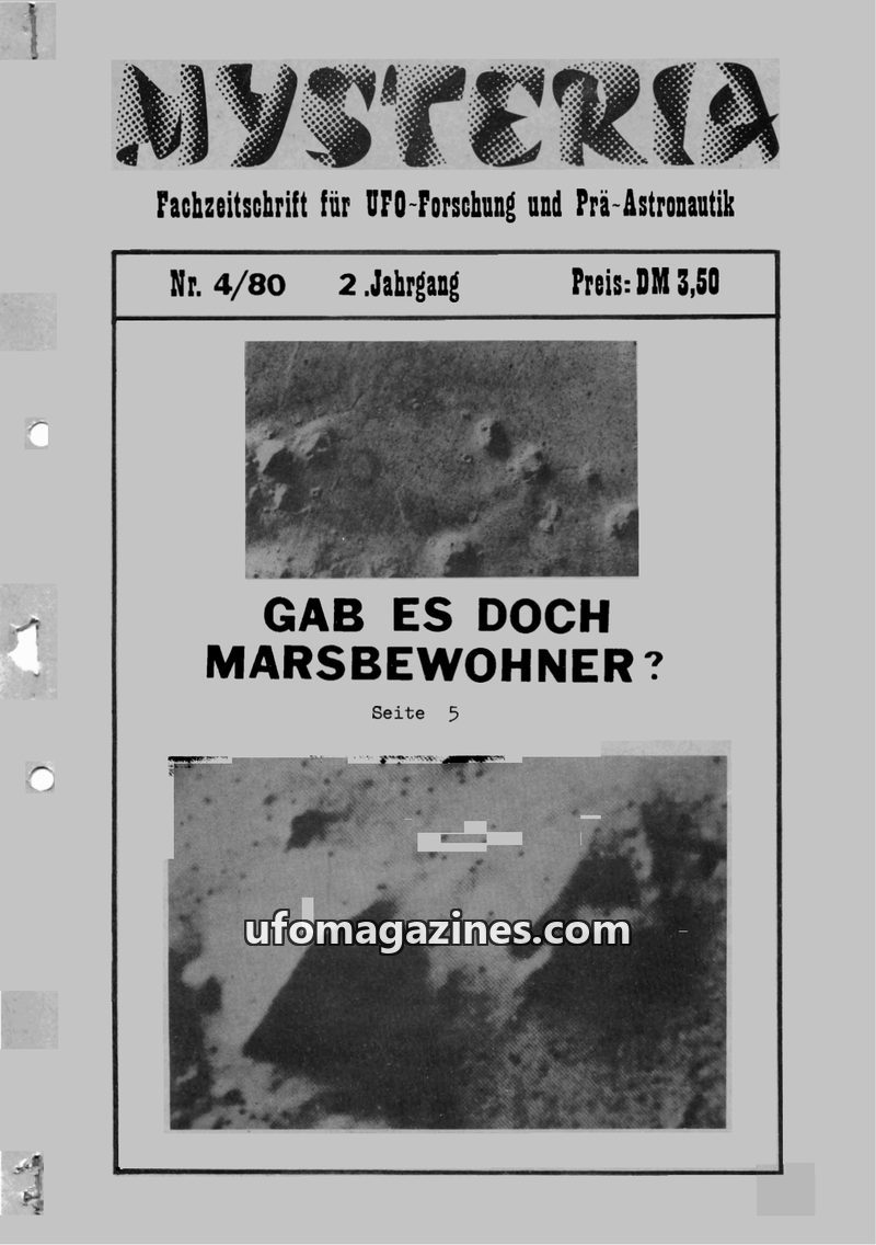 This issue of MYSTERIA, a journal for UFO research and pre-astronautics, covers a variety of topics including a UFO sighting in Mölln, Germany, and glowing UFOs over Denmark. It de