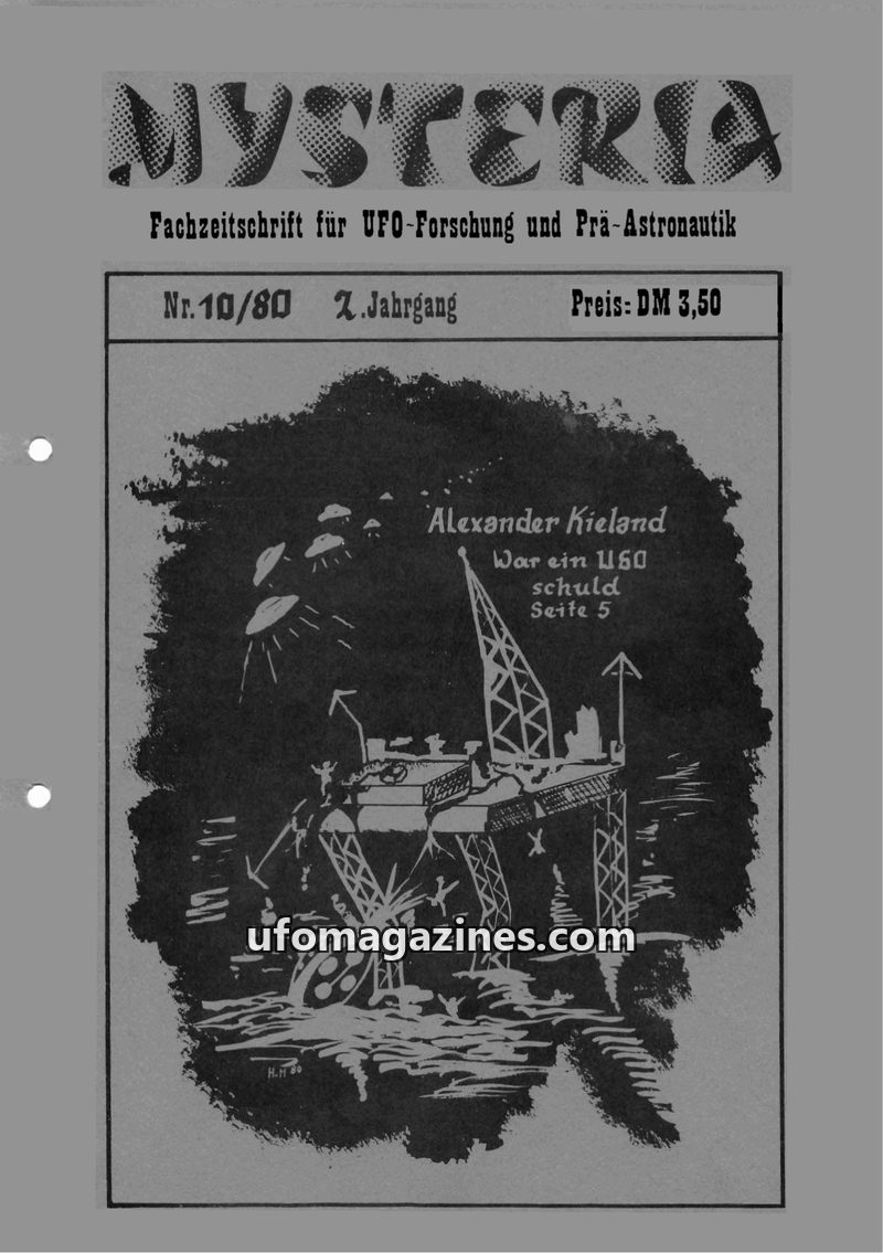 This issue of MYSTERIA, dated October 1980, focuses on UFO research and pre-astronautics. It investigates the disaster of the 'Alexander Kieland' oil rig, proposing a USO (Unidenti