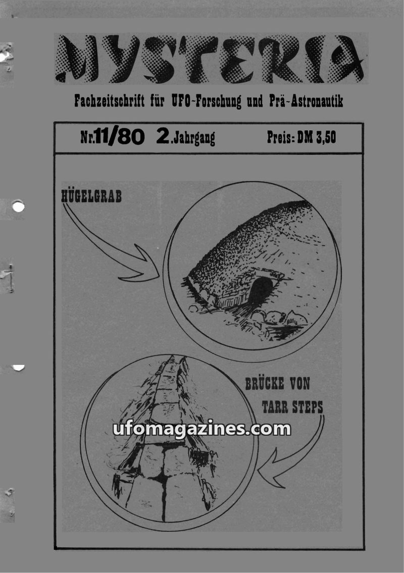 This issue of MYSTERIA magazine, dated November 1980, delves into ancient mysteries and UFO phenomena. Articles discuss the enigmatic Hügelgräber (burial mounds) and the ancient Ta