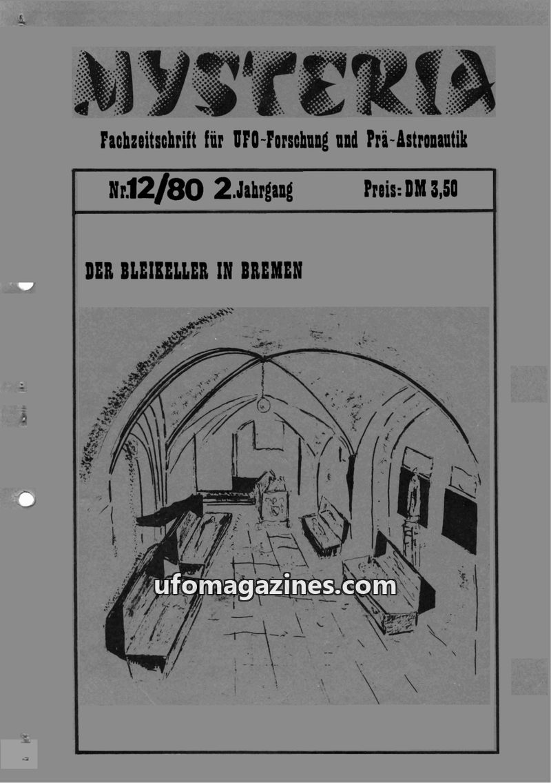 This issue of MYSTERIA, dated 12/80, features an article on the 'Bleikeller' (lead cellar) in Bremen, a crypt containing mummified bodies. It also delves into UFO phenomena, includ