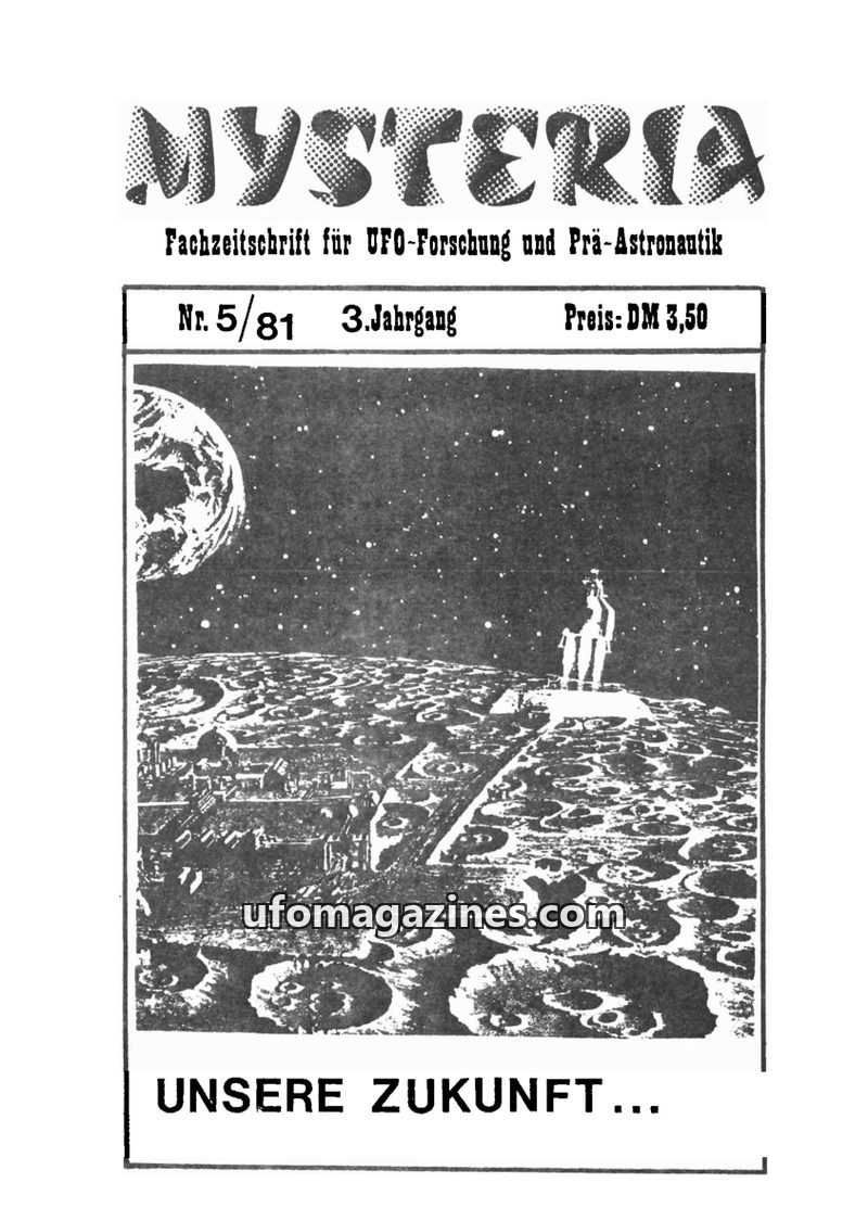 This issue of MYSTERIA focuses on UFO research and pre-astronautics, with a cover story on 'Our Future'. It includes articles on a UFO sighting in the Black Forest, the mysterious