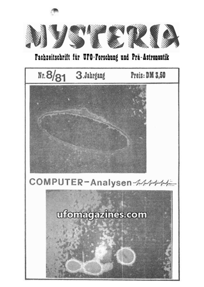 This issue of MYSTERIA, dated 8/81, focuses on UFO research and pre-astronautics. It features an article on computer analysis of UFO photos by Michael Hesemann, discussing the work