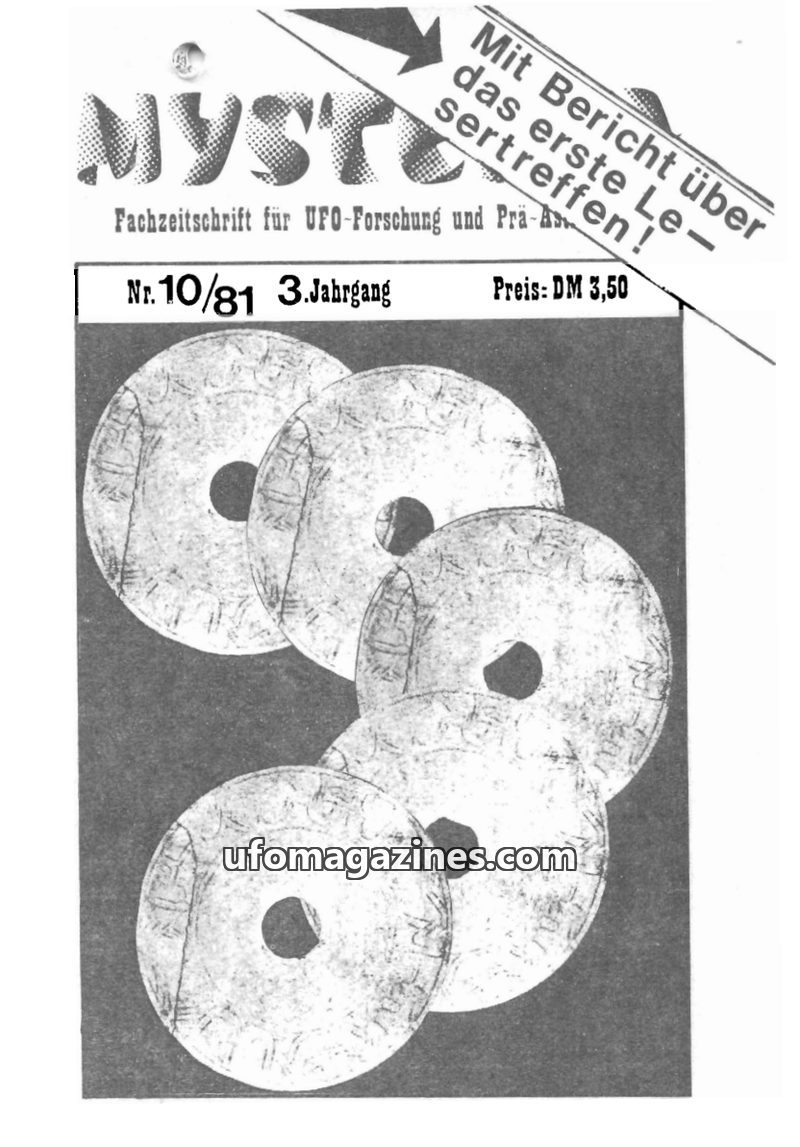 This issue of MYSTERIA magazine (10/81) delves into the enigmatic Baian-Kara-Ula stone discs, purportedly 12,000 years old, featuring spiral writing and found in Chinese-Tibetan ca