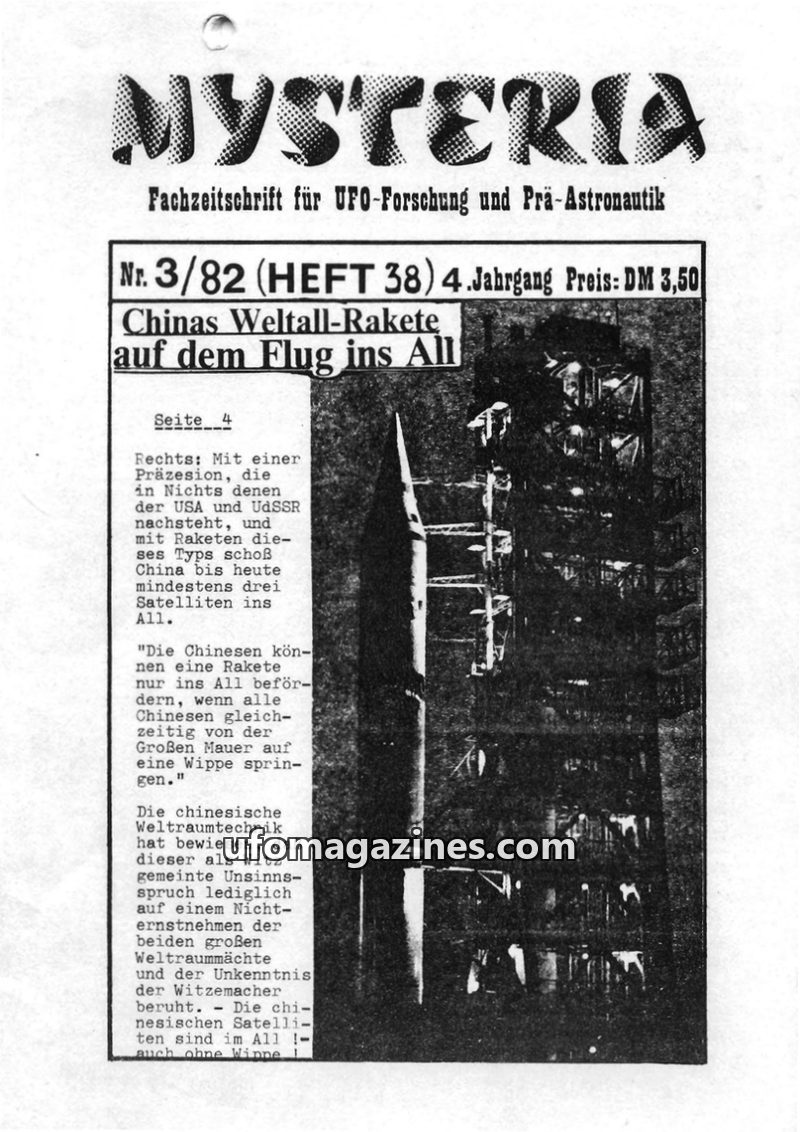 This issue of MYSTERIA, a German journal for UFO research and pre-astronautics, covers UFO sightings and research in China, including a notable incident near the Great Wall in 1980