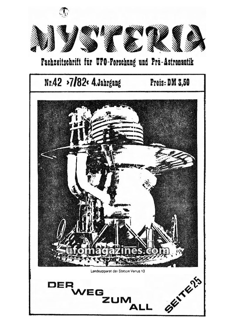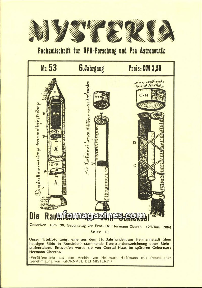 This issue of MYSTERIA focuses on space travel and pre-astronautics, with a special tribute to rocket pioneer Hermann Oberth on his 90th birthday. It delves into the history of roc