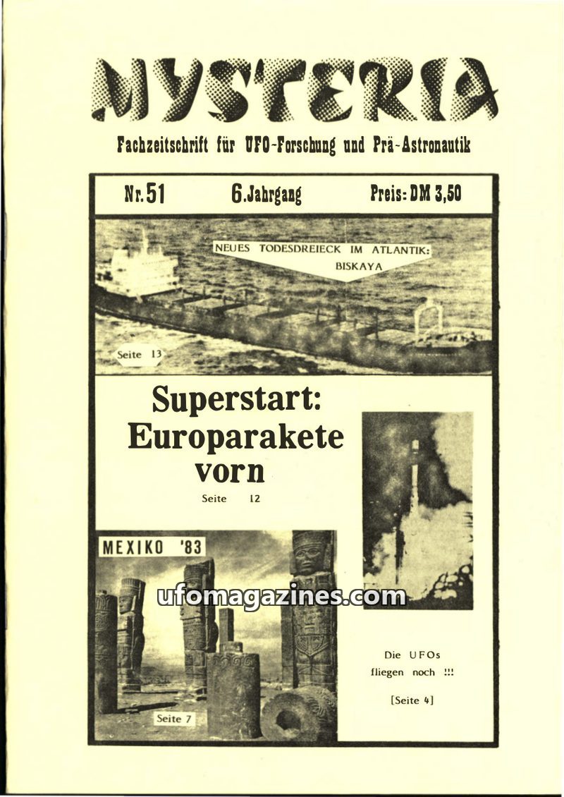 This issue of MYSTERIA (Nr. 51) delves into various unexplained phenomena and scientific advancements. It discusses the mysterious disappearances in the Biskaya region, comparing i