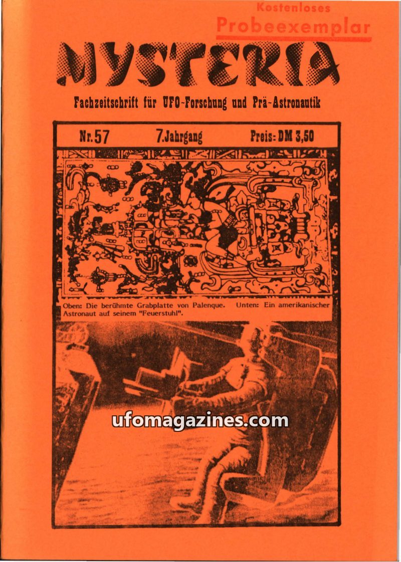 This issue of MYSTERIA magazine (Nr. 57, 7th year) delves into the 'Maya-Grabplatte von Palenque' and its interpretation as a depiction of an astronaut in a spacecraft, contrasting