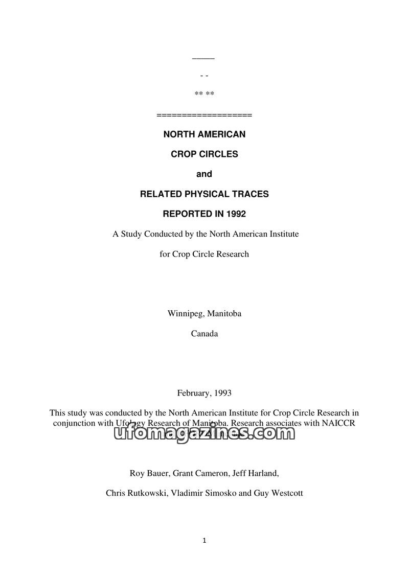 This report details a study conducted by the North American Institute for Crop Circle Research (NAICCR) and Ufology Research of Manitoba (UFOROM) on unusual ground markings (UGMs)