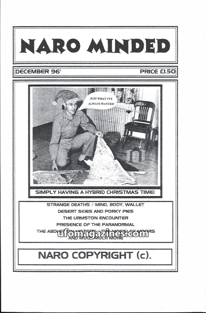 This issue of NARO Minded from December 1996 apologizes for delays and highlights a packed issue of reported anomalies. NARO, formerly MUFORA, is an organization focused on investi