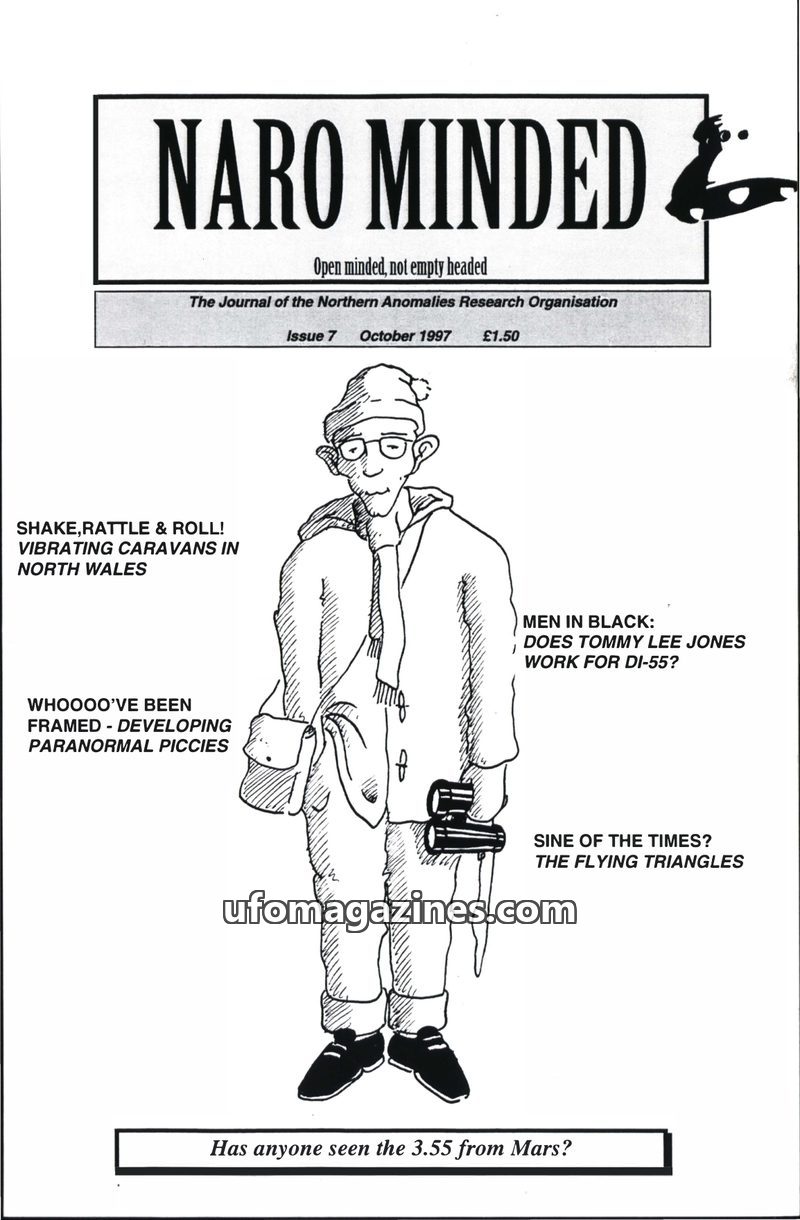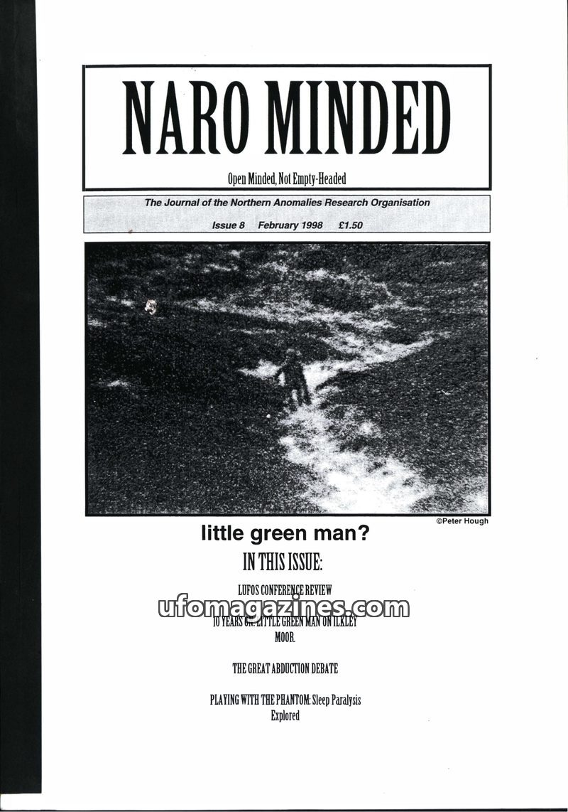 This issue of NARO Minded delves into various paranormal phenomena, including the 10-year anniversary of the Ilkley Moor 'little green man' sighting and photograph. It features a r
