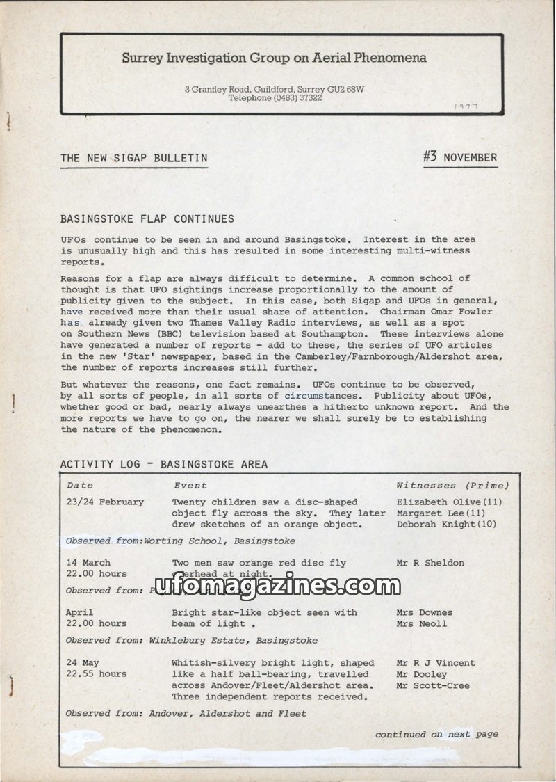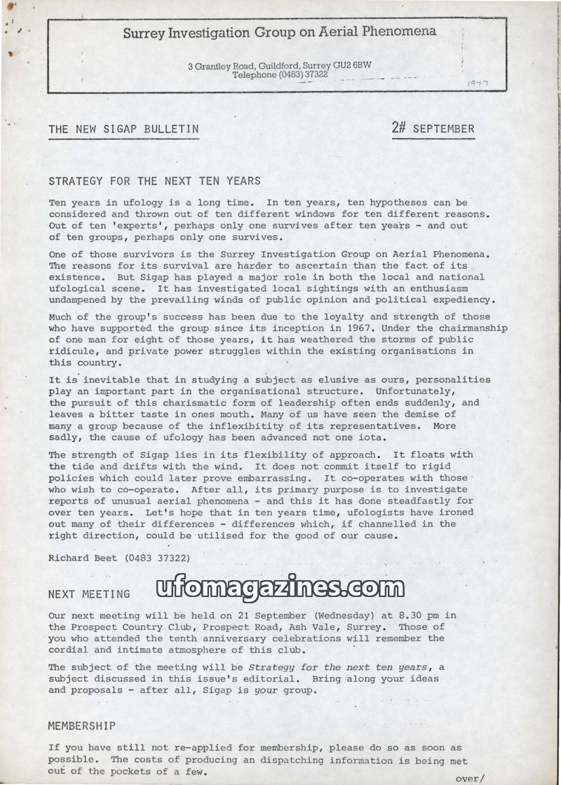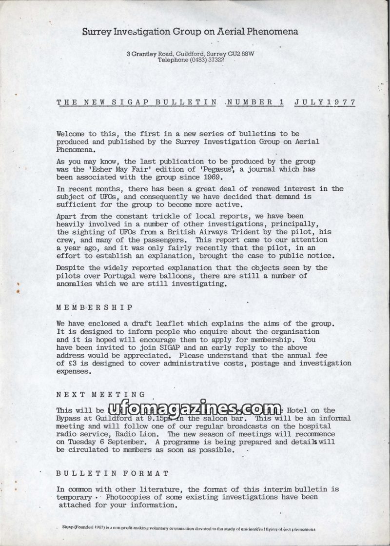 This is the first bulletin from the Surrey Investigation Group on Aerial Phenomena (SIGAP) in July 1977, marking a renewed activity due to increased interest in UFOs. The group has