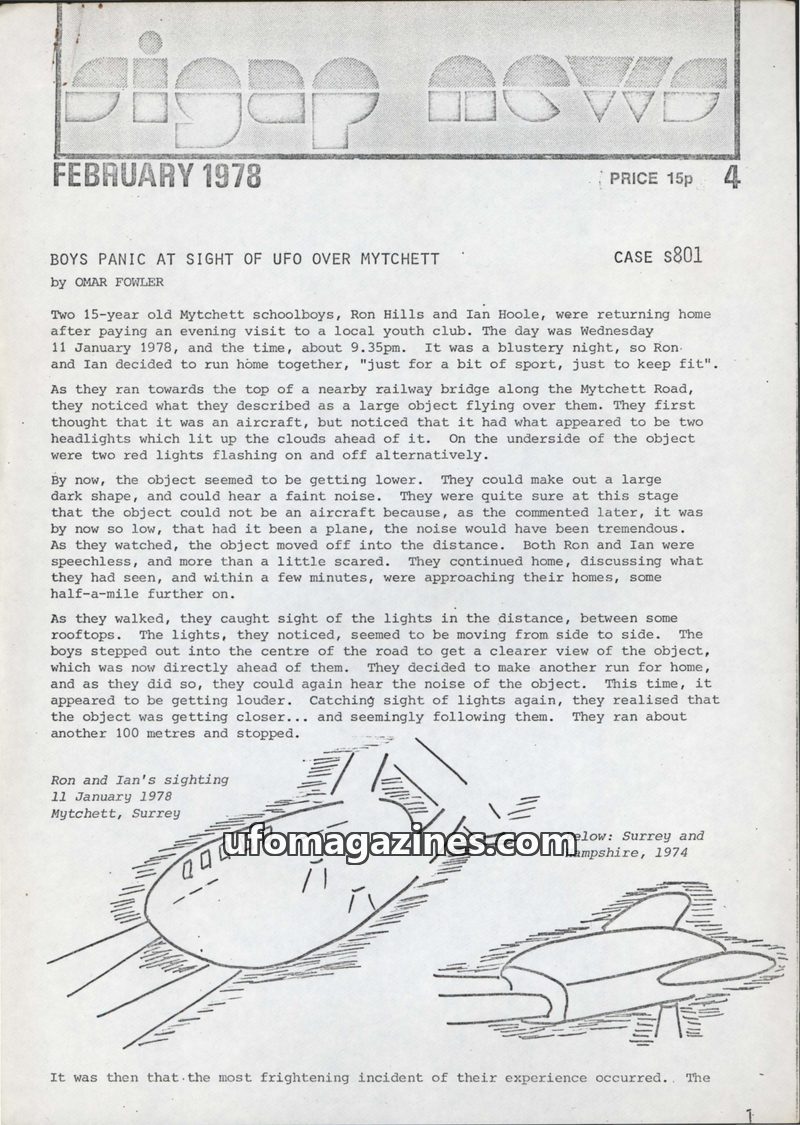 This issue of BIGAP NEWS covers two main topics. The first is a UFO sighting by two Mytchett schoolboys on January 11, 1978, who described a large dark object with flashing red lig