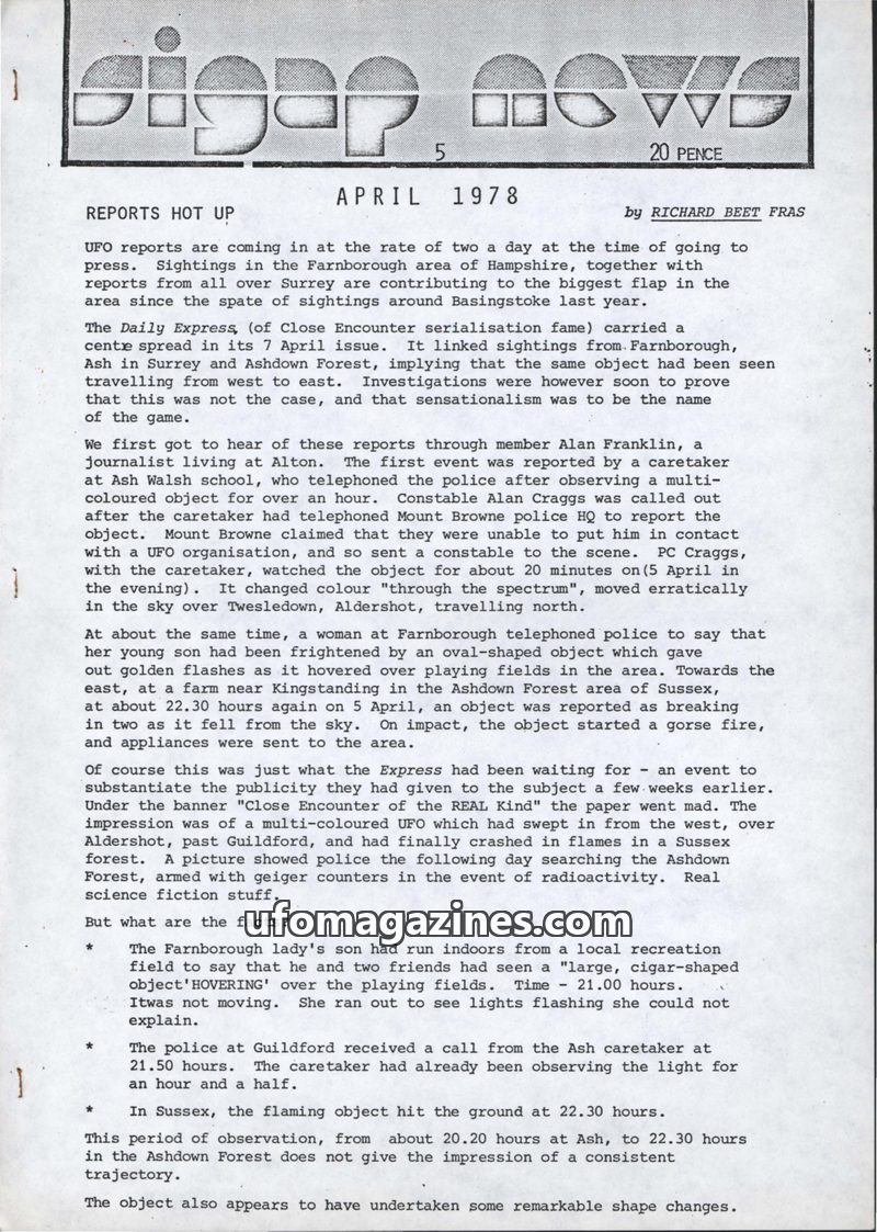 This issue of Sigap News reports a surge in UFO sightings in the Farnborough and Ashdown Forest areas in April 1978. The magazine critically examines media coverage, particularly b