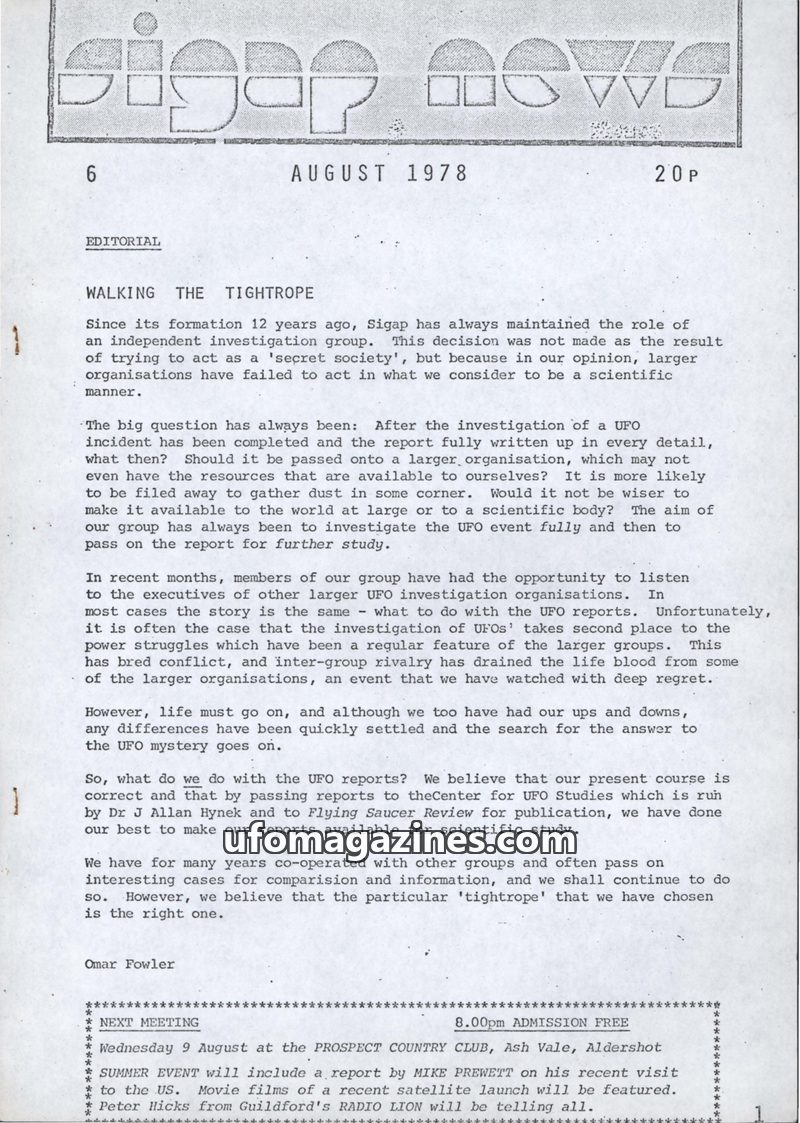 This issue of Sigap News, dated August 1978, focuses on the group's approach to UFO investigation and reporting. The editorial discusses the challenges of sharing findings with lar