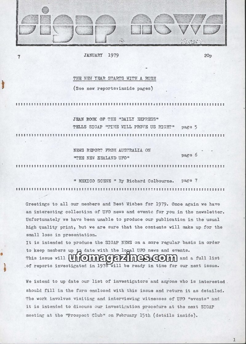 This January 1979 issue of SIGAP NEWS covers recent UFO reports and events. It includes a detailed account of a 1937 sighting in Surrey by Major F. Turner-Bridger, a report on the