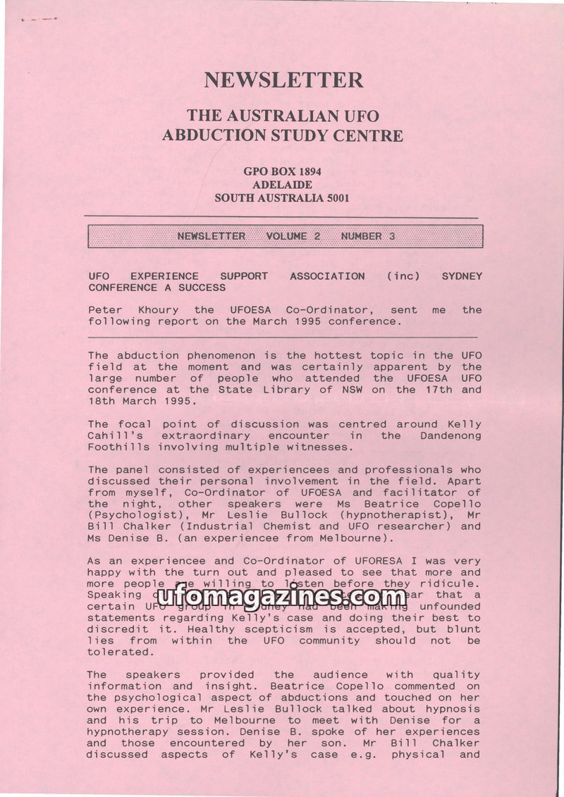 This issue of the Australian UFO Abduction Study Centre's Newsletter covers a successful UFO conference in Sydney, focusing on Kelly Cahill's abduction experience. It includes repo