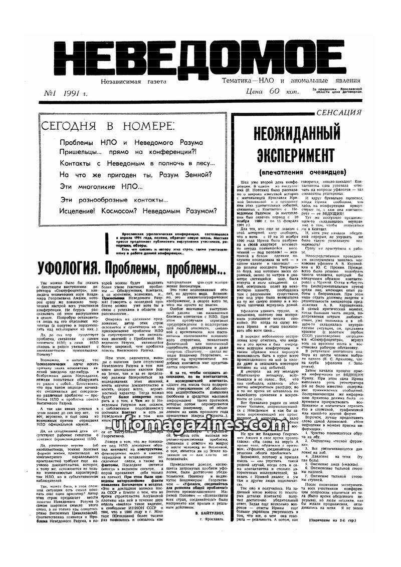 This issue of 'НЕВЕДОМОЕ' magazine from 1991 delves into UFO phenomena and the concept of an 'Unknown Mind'. It features reports from a Yaroslavl ufology conference, including disc