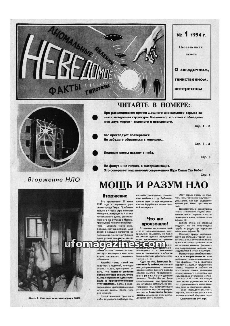 This issue of 'Nevedomoe' investigates anomalous phenomena, focusing on a powerful UFO-related explosion in Tver, Russia, in 1990, which caused selective destruction. It also discu